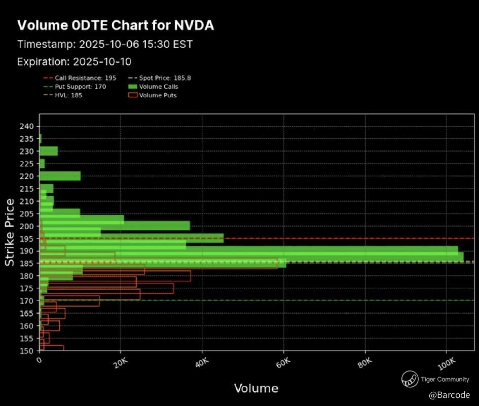 The 0DTE volume map shows dense call interest around 195, acting as a short-term resistance layer, with put support concentrated near 170. Spot sits around 185.8, straddling HVL at 185. The structure suggests bulls remain engaged but cautious, with positioning skewed toward tactical upside hedges rather than aggressive breakout chasing.
