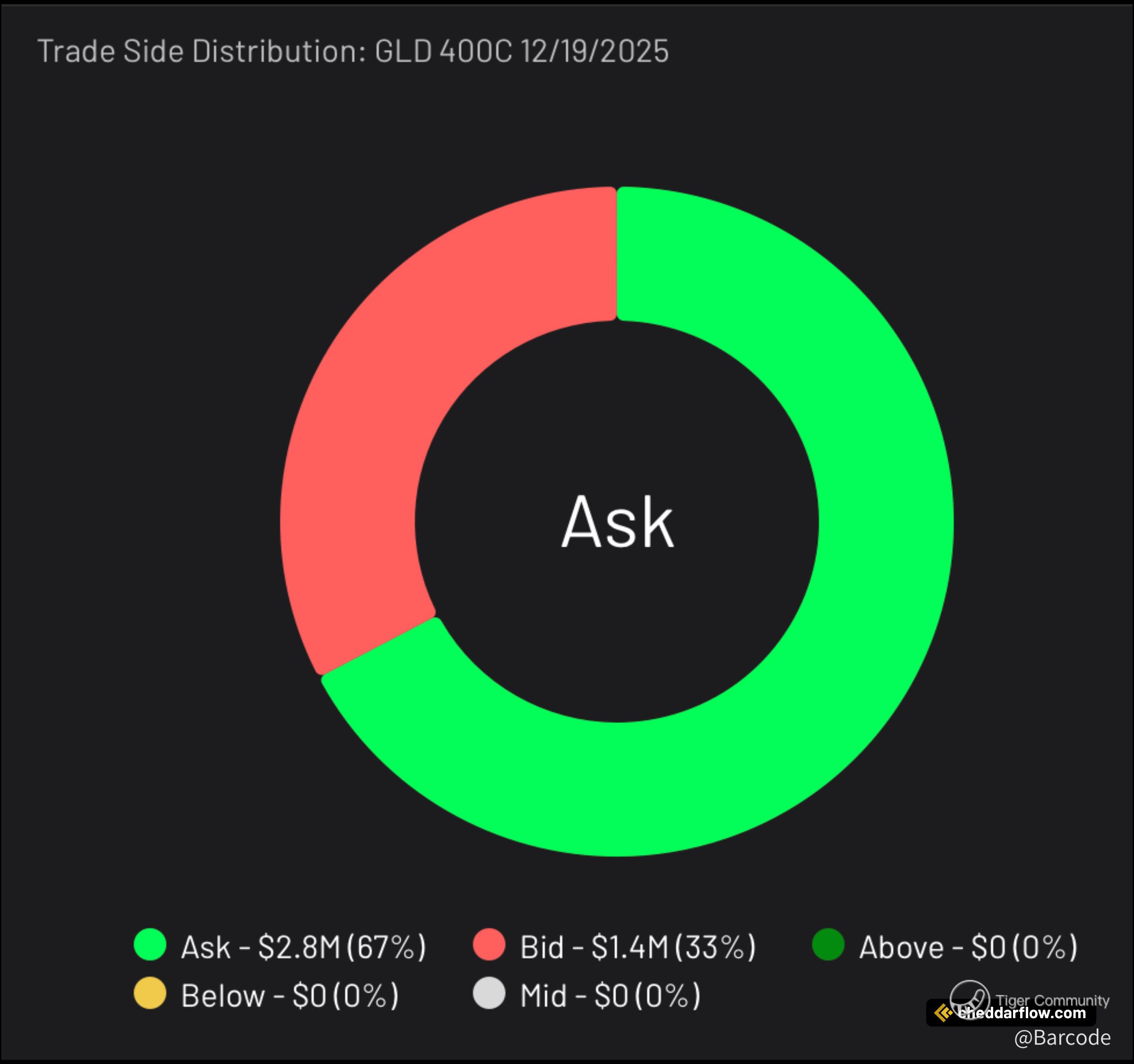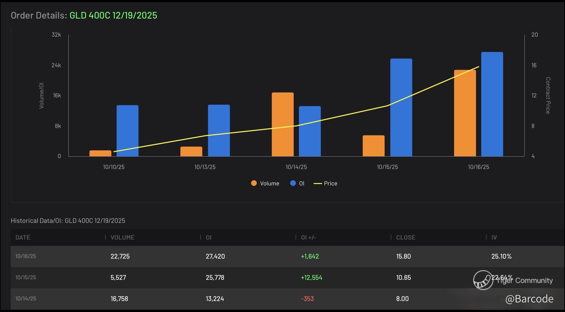 The GLD 400C 12/19/2025 contract has seen sustained accumulation across multiple sessions.