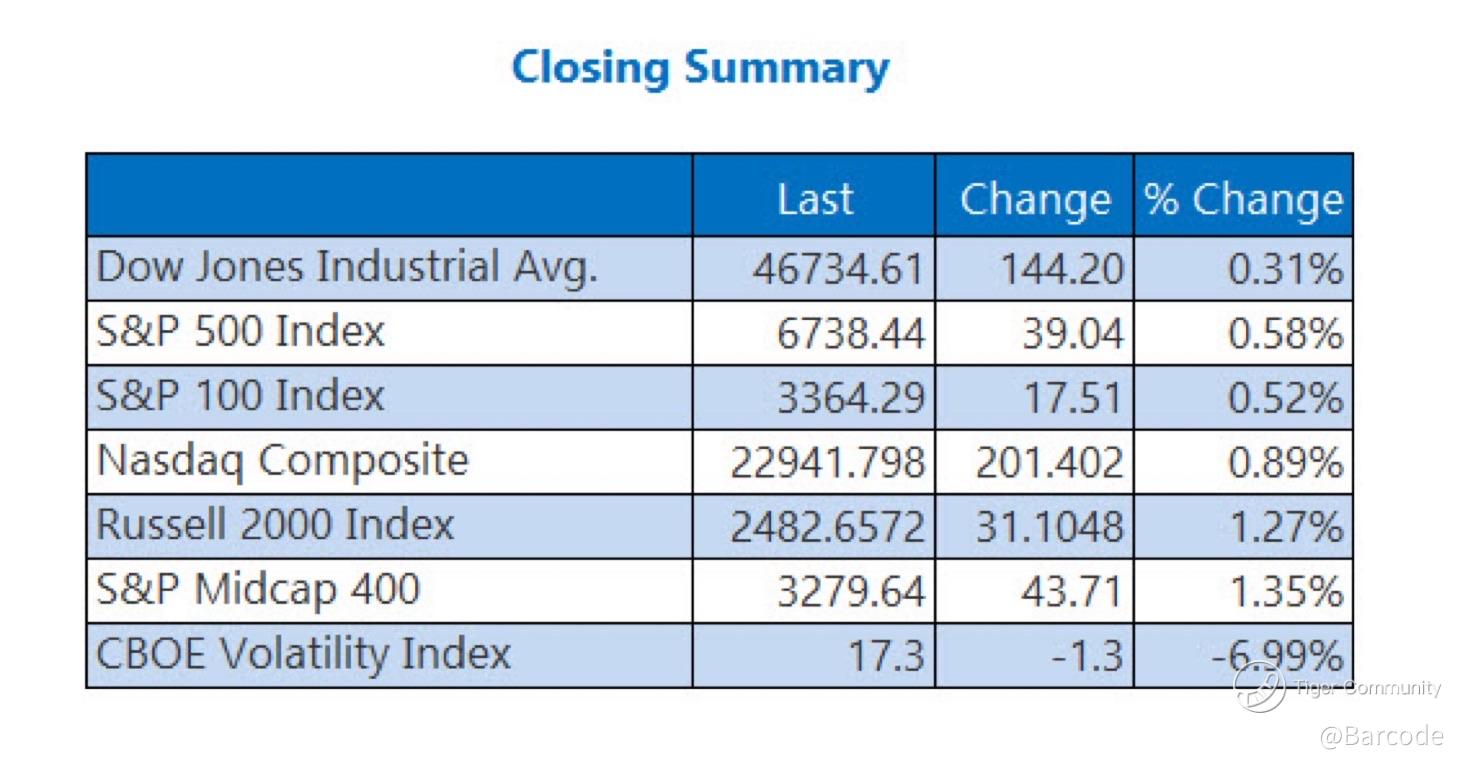 NASDAQ closed at 22 941.79 (+0.89%), extending its winning streak. The VIX fell 6.99% to 17.3, reflecting calm beneath geopolitical noise. The index trades above its 50-day EMA (22 850) with resistance near 23 540 and breakout potential toward 23 870–24 500. RSI 64 shows mild fatigue, yet market breadth is broadening: the Russell 2000 (+1.27%) and MidCap 400 (+1.35%) confirm rotation beyond megacaps.