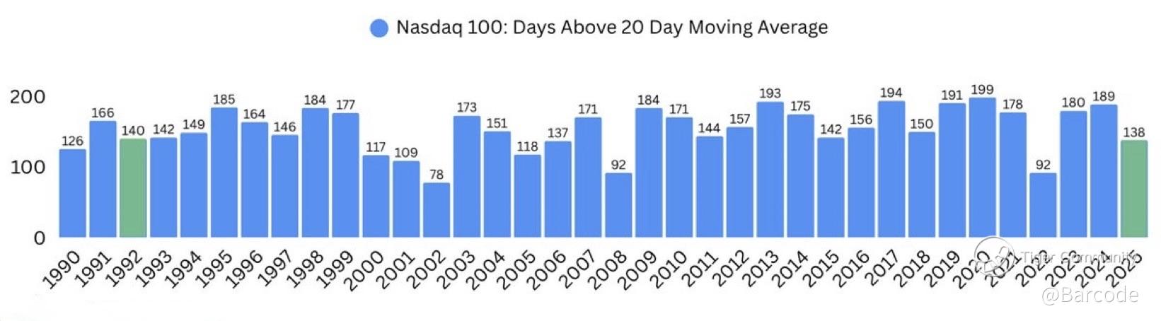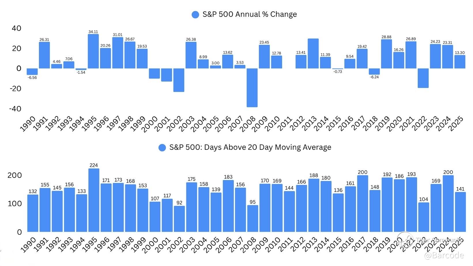 This year the S&P 500 has remained above its 20-DMA for 141 days, versus 200 in 2024. Positive years usually sustain longer runs, implying further Q4 upside potential. Even if diplomacy proves neutral, market structure still leans constructive.