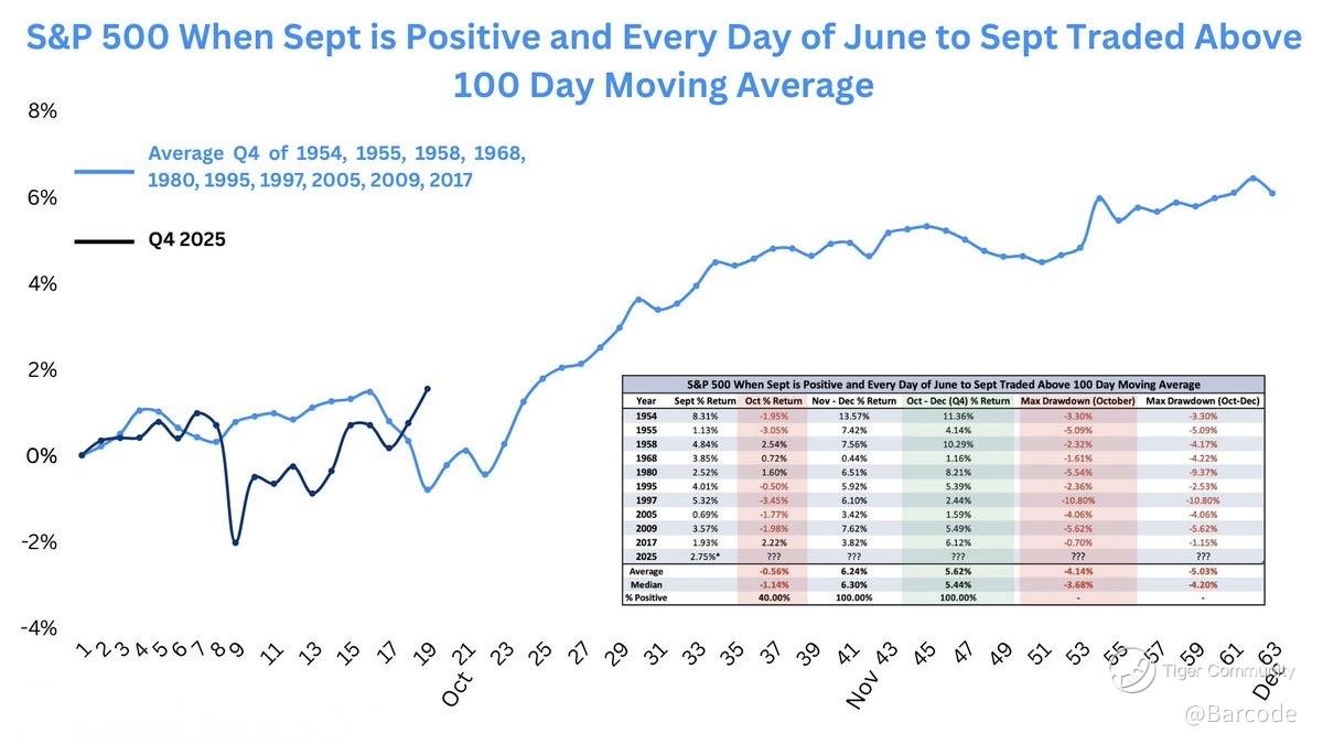 Seasonality reinforces that optimism. When the S&P 500 trades above its 100-day MA from June to September and ends September positive, Nov–Dec have been positive 100% of the time, averaging a +6% gain.