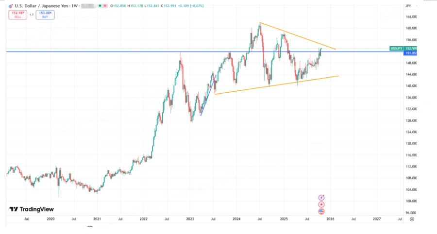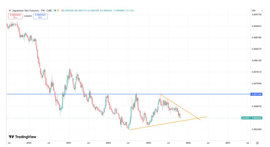 Since the end of 2024, the yen has been oscillating near its lows without a definitive breakthrough. It is well-known that the yen functions as a carry trade currency; its appreciation indicates deteriorating market risk appetite, whereas depreciation suggests the market structure is healthy. The USD/JPY pair exhibits a broad range-bound consolidation pattern, which can be used as a comparative reference.