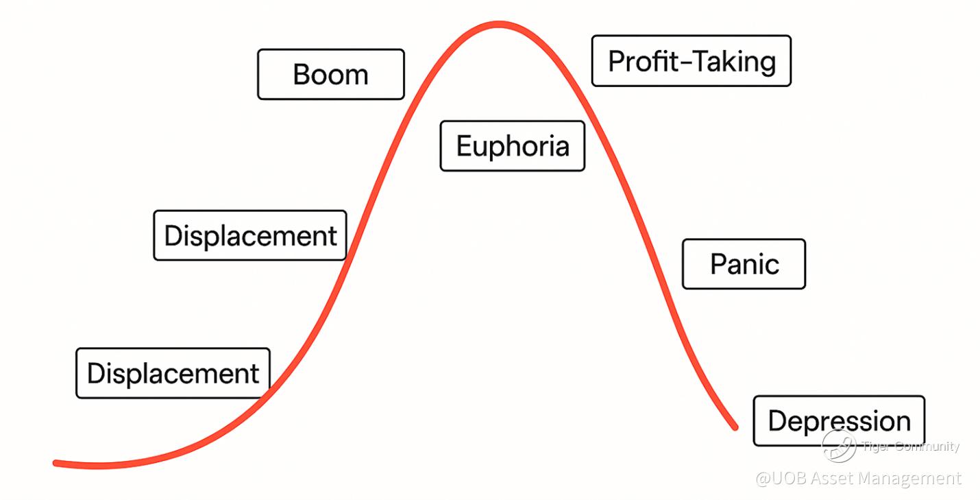 So how can we assess whether we are in an AI bubble, and if so, how long can this bubble last? One way is to look at how bubbles develop. Lessons from the 1990s tell us that there are typically six stages: