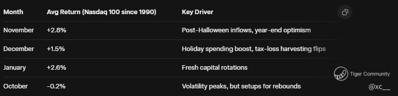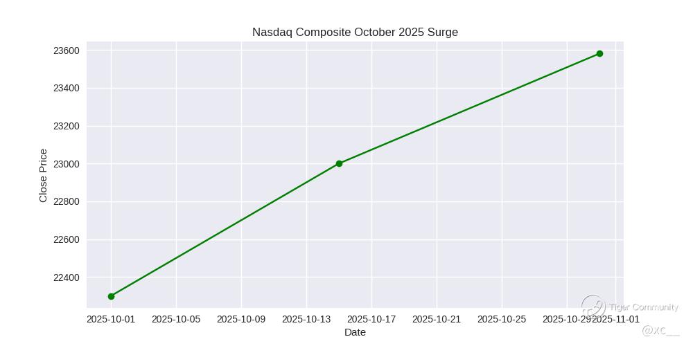 $NASDAQ(.IXIC)$ October delivered a powerhouse punch with the Nasdaq Composite surging 5.6%, fueled by tech titans flexing amid AI breakthroughs and easing rate pressures. This isn't just another monthly blip—it's the setup for what savvy traders call the Halloween Indicator, where markets historically ignite from November through April, outpacing the summer slump by an average 4.5% in returns. With the index closing near 23,581 after climbing from early-month dips, investors are eyeing whether this momentum catapults us into year-end gains or if volatility sneaks in from lingering economic headwinds.