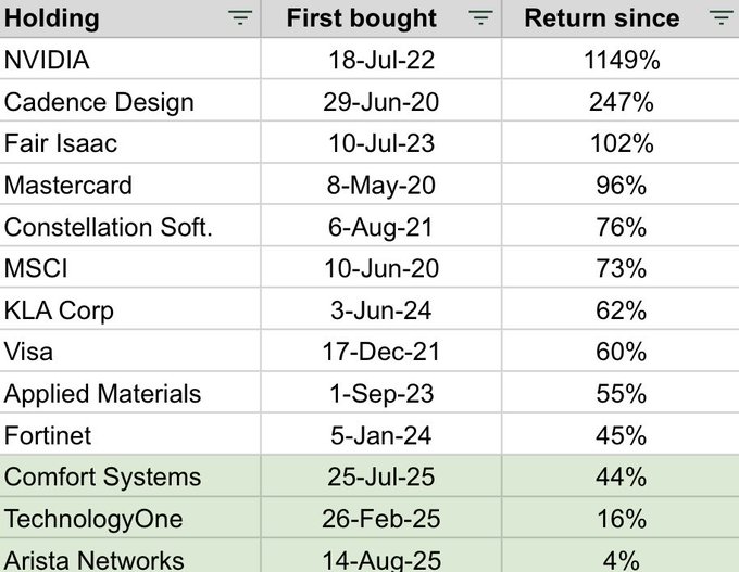Table listing holdings with columns for company names like $NVIDIA(NVDA)$ $Cadence Design(CDNS)$ $Fair Isaac(FICO)$, first purchase dates such as 18-Jul-22 for NVIDIA, and return percentages including 1147 percent for NVIDIA and 96 percent for Mastercard.