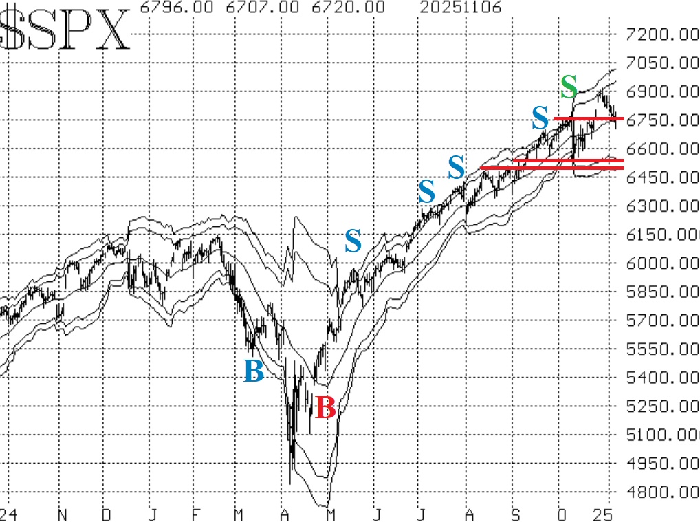 After having gapped to new all-time highs a little more than a week ago, the broad stock market has gone into a modest (so far) corrective mode. $SPX has now closed both of the gaps that were in place from late October, and has closed below the first support level of 6750. This is not a major breakdown of the chart at this point. $SPX has merely pulled back to its rising 20-day moving average. The next support level is the 6500-6550 level that has been tested and held several times. If that were to be broken, then a much more bearish outlook would be in store.