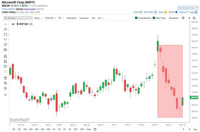 A financial candlestick chart for Microsoft Corporation (MSFT) displays extended hours real time data over five months from July to November with price axis from 400 to 500 dollars volume bars below green and red candlesticks showing trading sessions a pink highlighted box around recent bars indicating the 8-day losing streak period and technical indicators like moving averages.