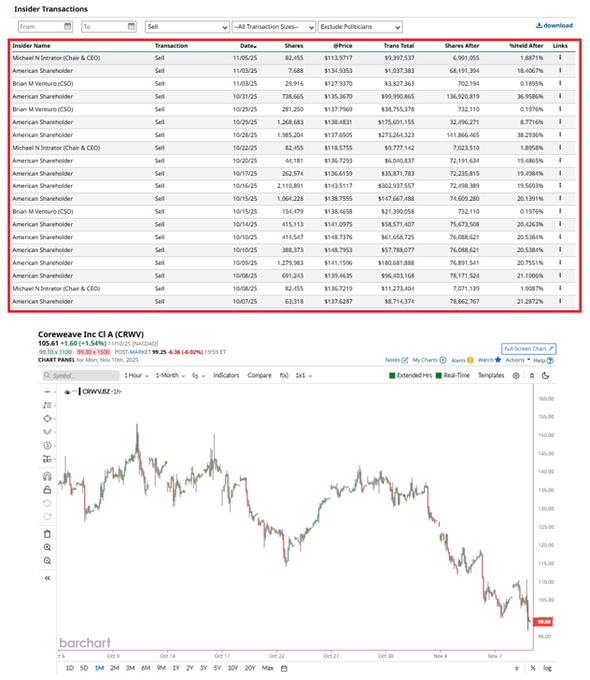 All the CoreWeave $CRWV insiders were able to cash out before the company guided lower on earnings 📉📉