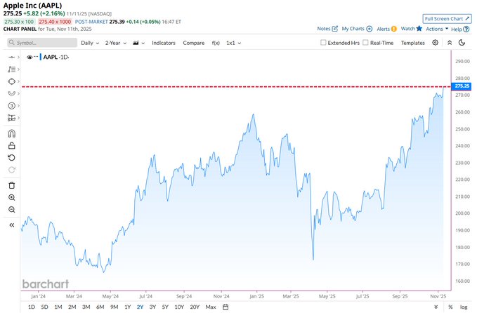 Stock chart for Apple on Nasdaq displaying candlestick price movements from April to November with a red horizontal line at 237.59 indicating the highest close volume bars at bottom time axis labeled by months y-axis price scale from 160 to 240 dollars