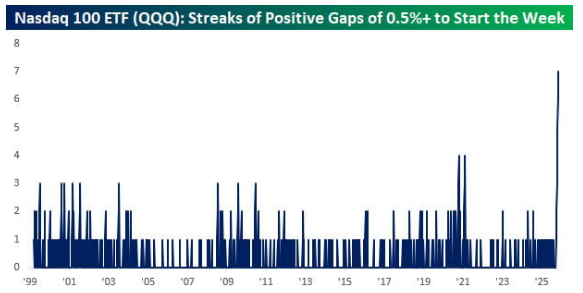 Nasdaq $QQQ has now gapped up at least 0.5% on the first trading day of the week 7 consecutive times, the longest streak in history