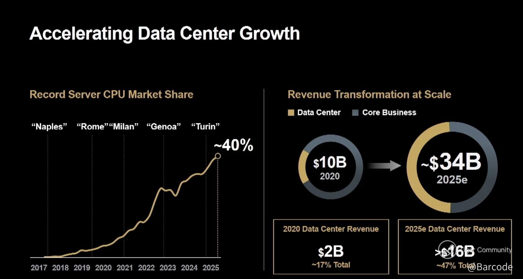 Lisa Su’s relentless roadmap, Naples → Turin, has dismantled every legacy moat. $AMD now commands nearly 40% of global server CPU share, its data-centre revenue set to rocket from $10B in 2020 to $34B by 2025, with $16B+ from servers alone.