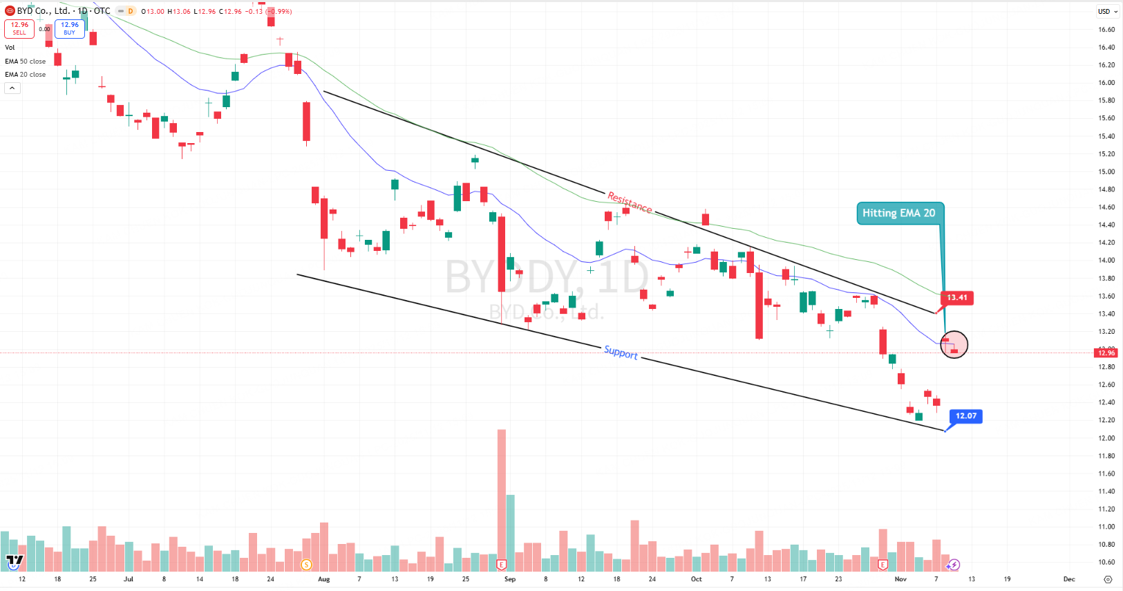 Immediate resistance: $13.50–14.00 (EMA cluster + recent breakdown area)