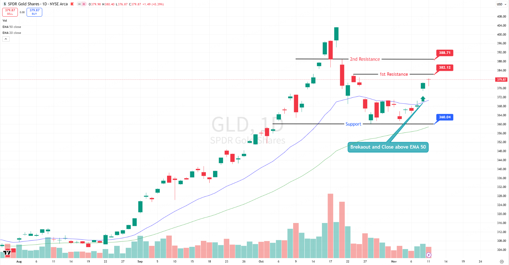 SPDR Gold Shares (GLD) closed at $379.87, up 0.39%, extending its recovery from the early-November dip near $360.
