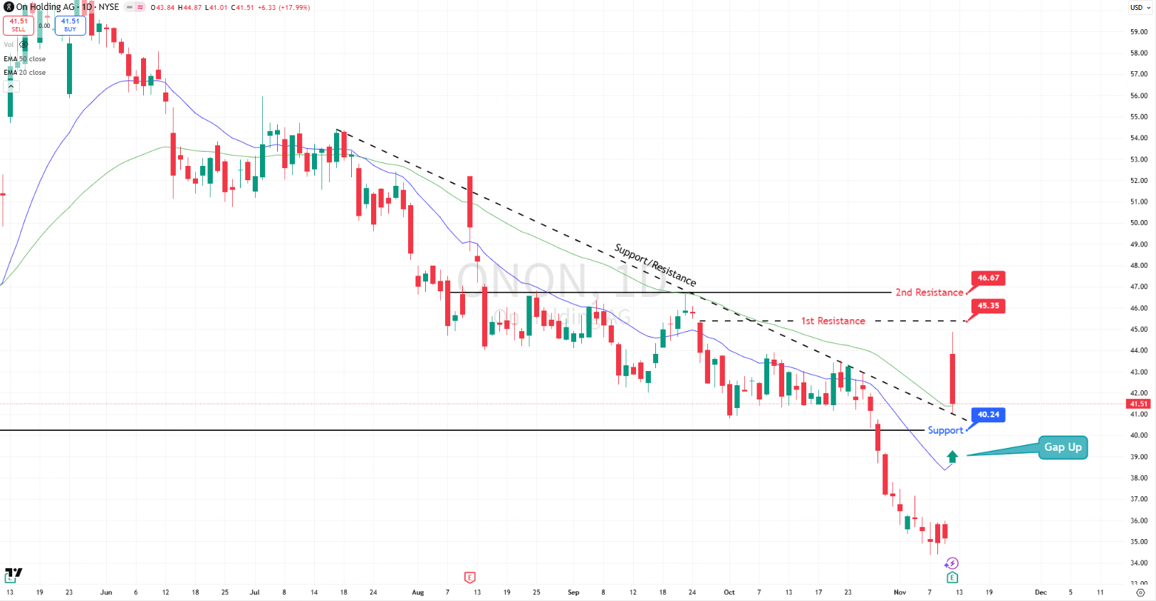 On Holding closed at $41.51, surging +17.99% after a major upside gap triggered by earnings.