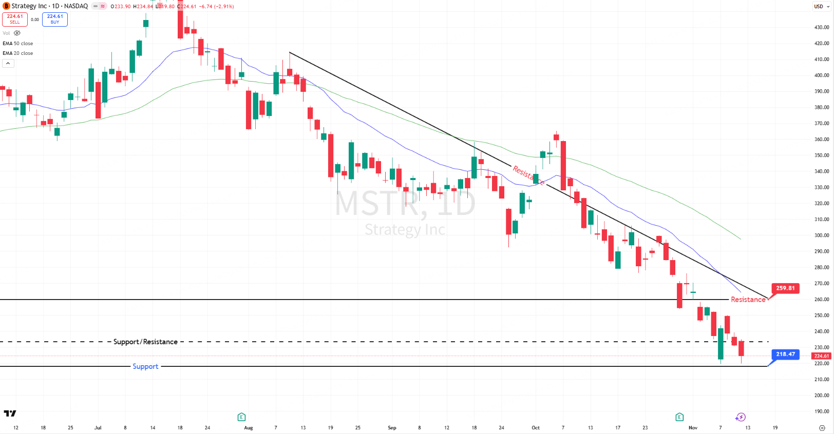 MicroStrategy closed at $224.61, down -2.91%, marking another lower-low in a persistent multi-month downtrend and now sitting ~-58% below its 52-week high of $543.00 (Yahoo).
