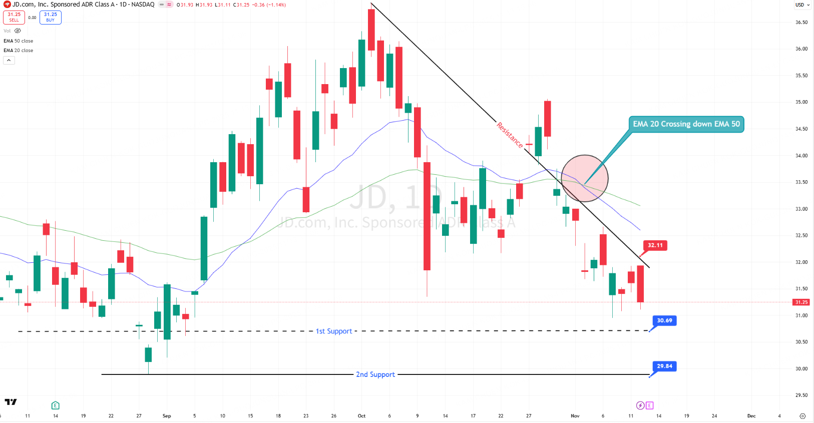 Price remains pinned beneath both the 20-EMA ($32.60) and 50-EMA ($33.05), with neither reclaimed—keeping JD firmly locked in a bearish structure.