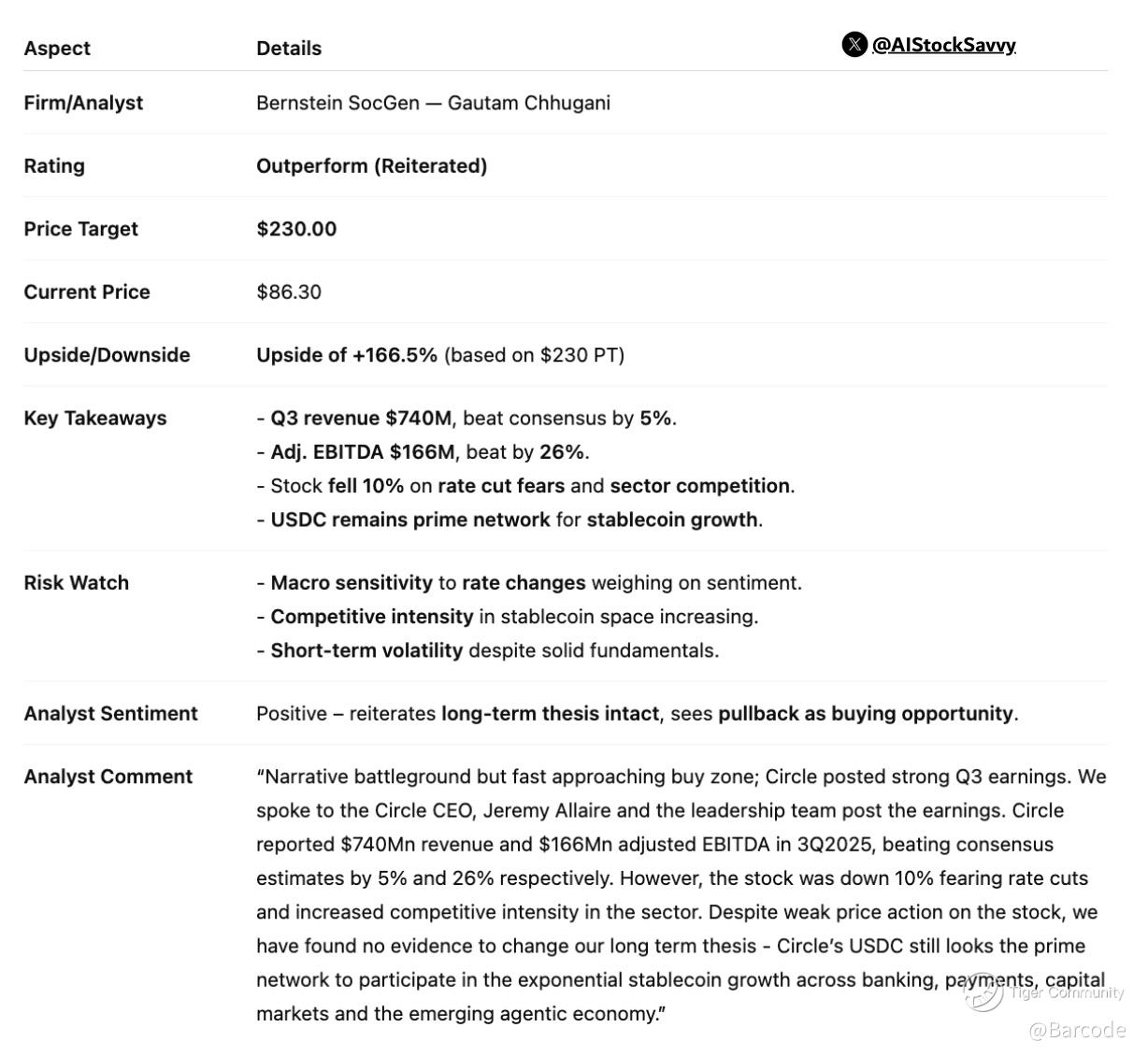 Bernstein SocGen reiterates Outperform with a $230 price target and highlights Circleโs strong Q3 performance. Revenue of $740M beat expectations by 5%, and adjusted EBITDA of $166M exceeded estimates by 26%. Analysts continue to see the recent pullback as sentiment driven rather than structural, with long term fundamentals remaining firmly intact.