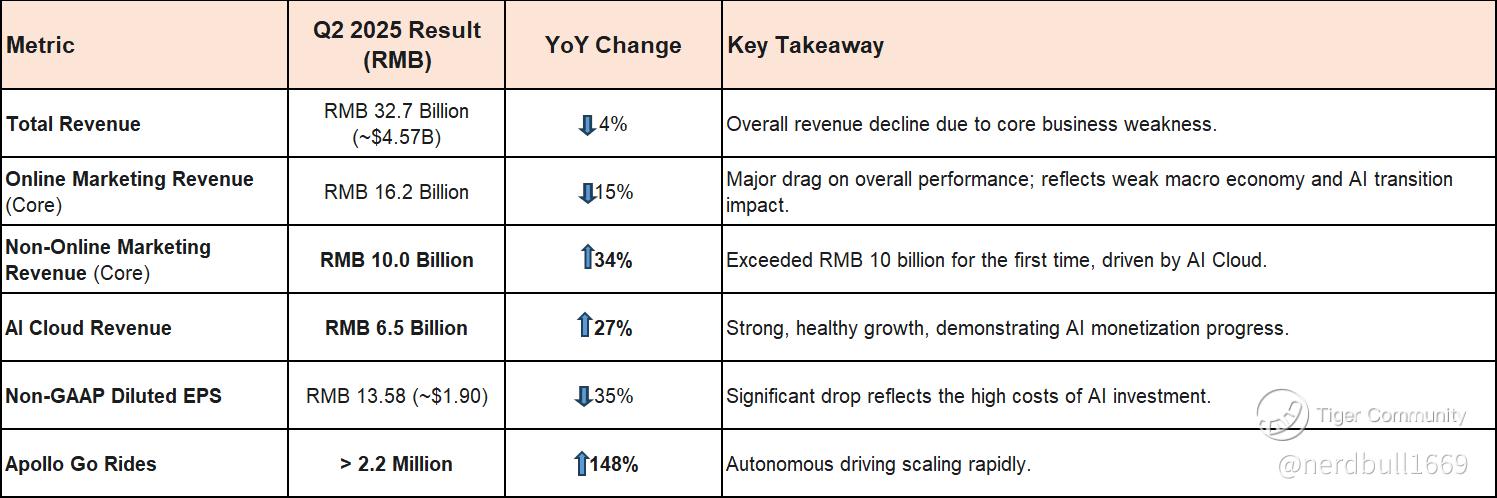 High AI Investment Costs: The large decrease in Non-GAAP EPS ($1.90, down 35% YoY) was a direct result of substantial investments in AI infrastructure (e.g., purchasing GPUs, R&D) necessary to power its ERNIE large language model and AI Cloud services.