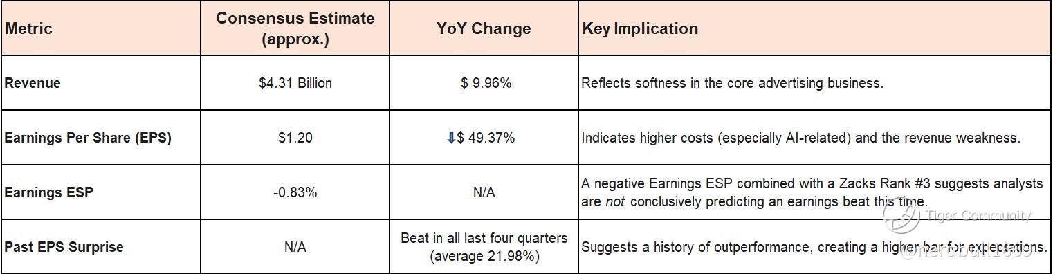 Analyst consensus suggests a challenging quarter in terms of year-over-year (YoY) growth, primarily due to persistent headwinds in the core online marketing business and elevated AI infrastructure costs.