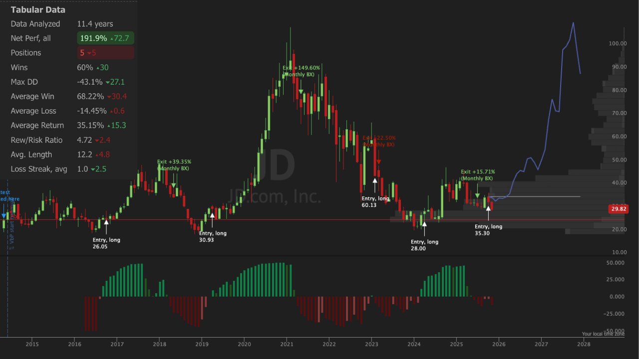 Since then, $JD has dropped 14% and the Monthly BX is now printing dark red / lower low. This is a strong reason to consider exiting.