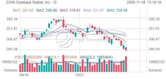 $Coinbase Global, Inc.(COIN)$ closed at $263.95 (-7.06%), significantly retreating from recent highs around $444.64, now approximately 40.6% below its 52-week peak, indicating substantial downward pressure.