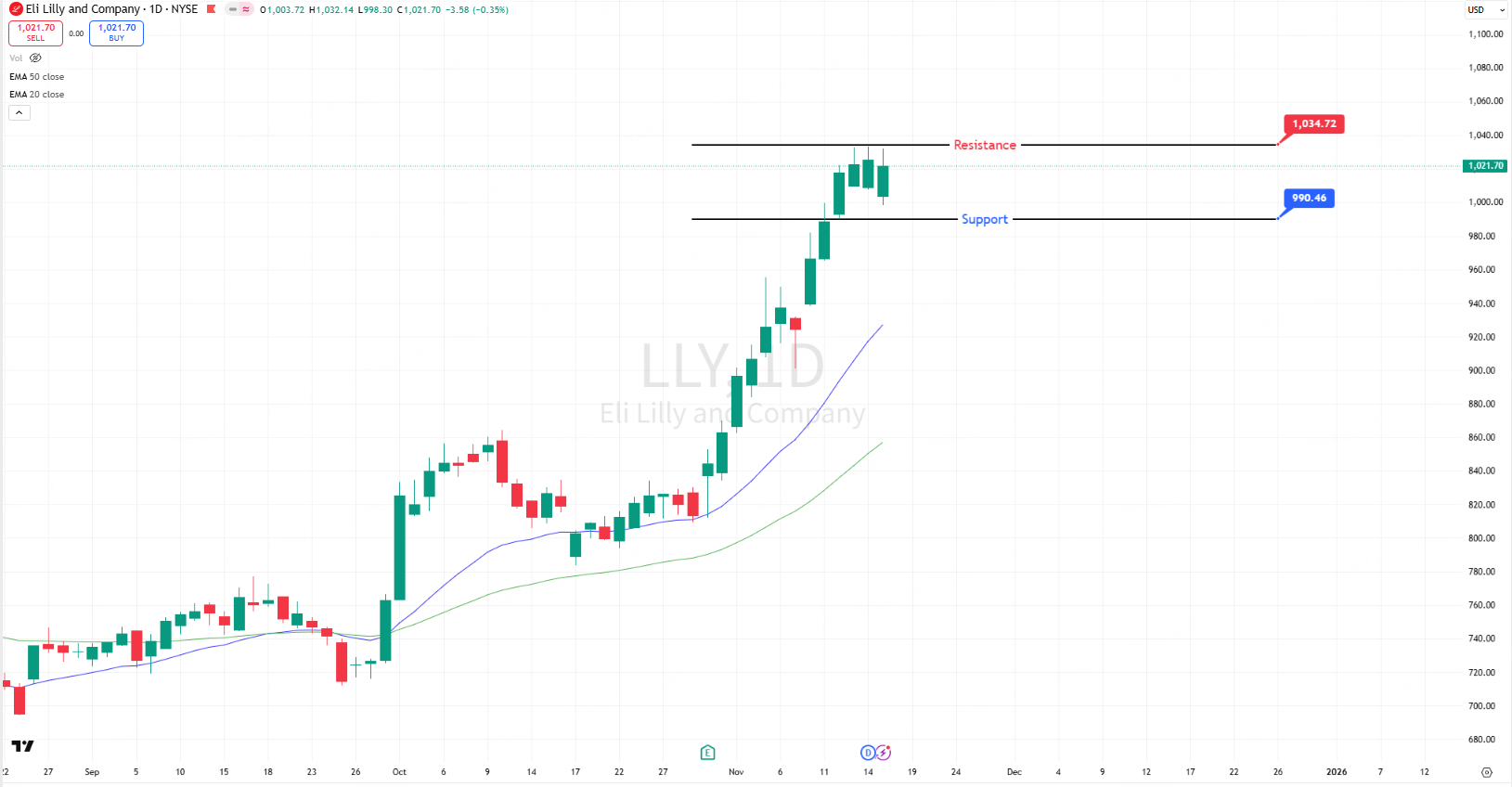 LLY closed at $1,021.70 (-0.35%), down $3.58 from previous high of $1,025.28, just 1.2% away from the 52-week high of $1,033.62, maintaining strong upward momentum near record levels.