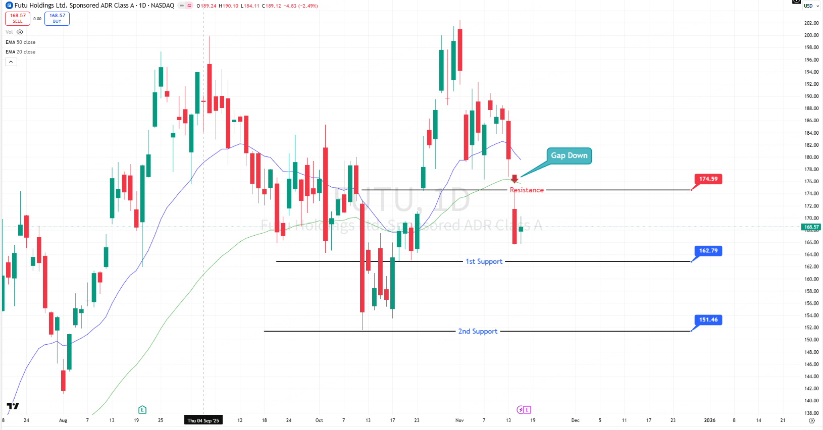 FUTU closed at $168.57 (+1.69%), recovering +$2.80 from previous close of $165.77.