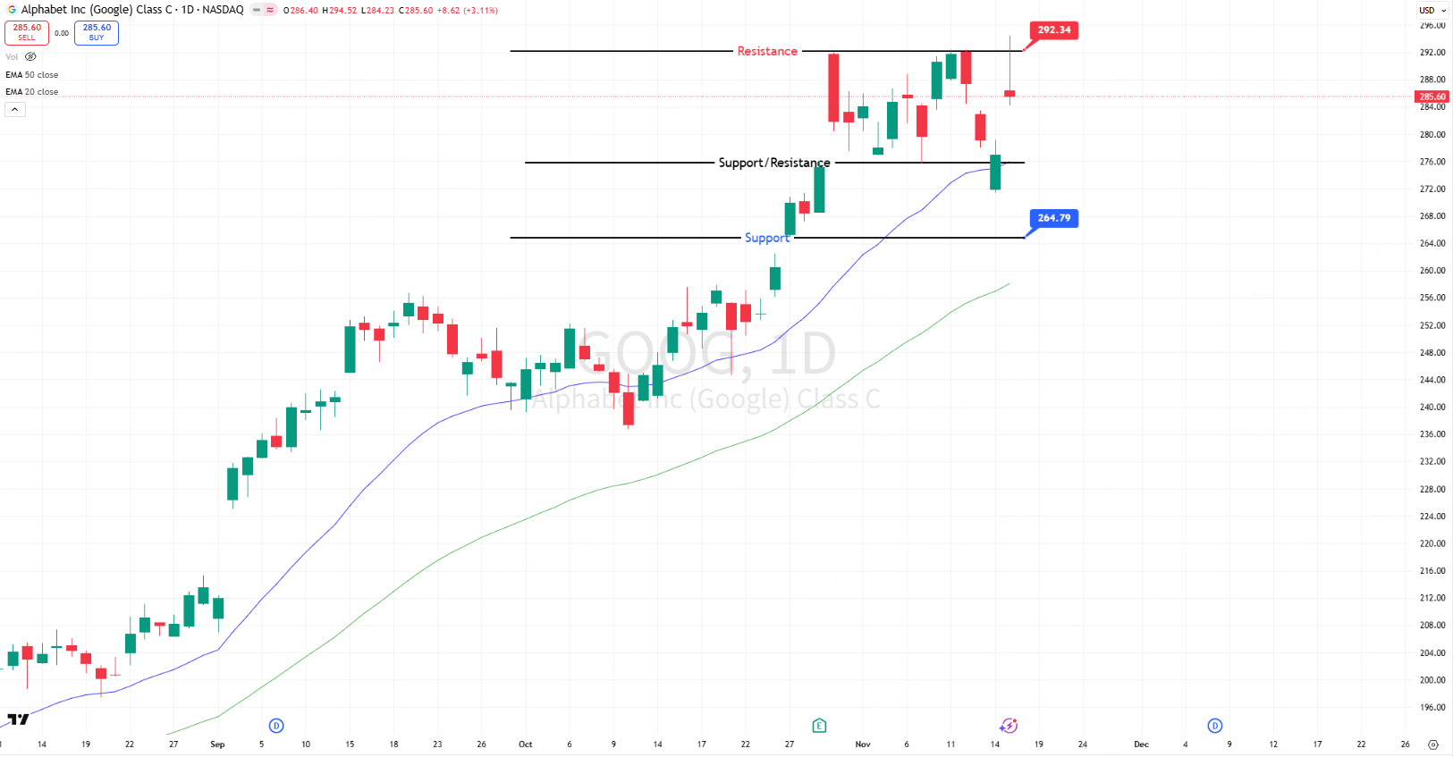 GOOG closed at $285.60 (+3.11%), hitting a new 52-week high of $294.52, surging past previous resistance levels with strong momentum confirmation.