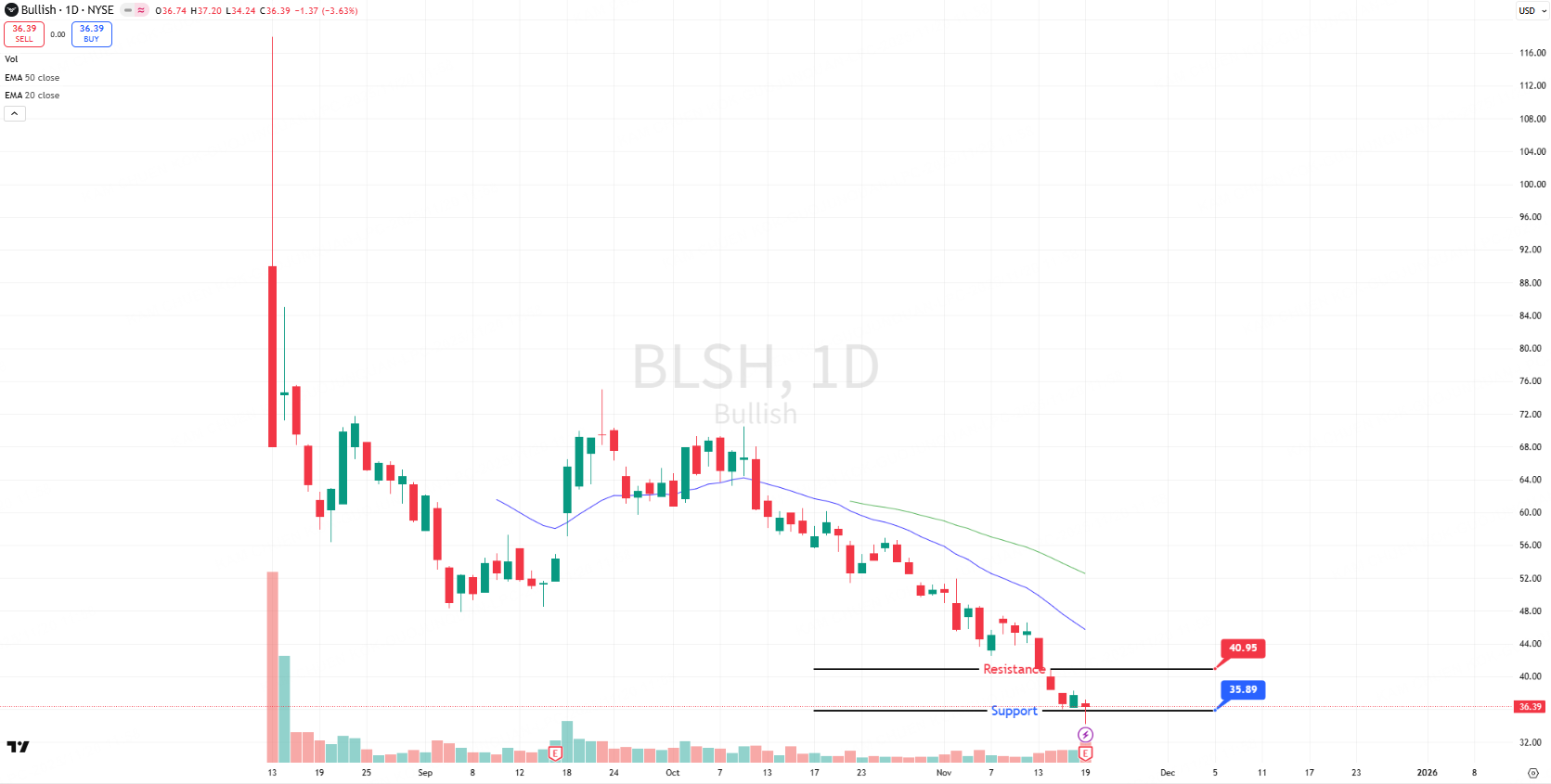 Latest Close (ET): BLSH closed at $36.39 (-1.37%), rebounding from near 52-week low of $36.02, still 68% below its peak high of $118.00, indicating significant recovery room ahead.