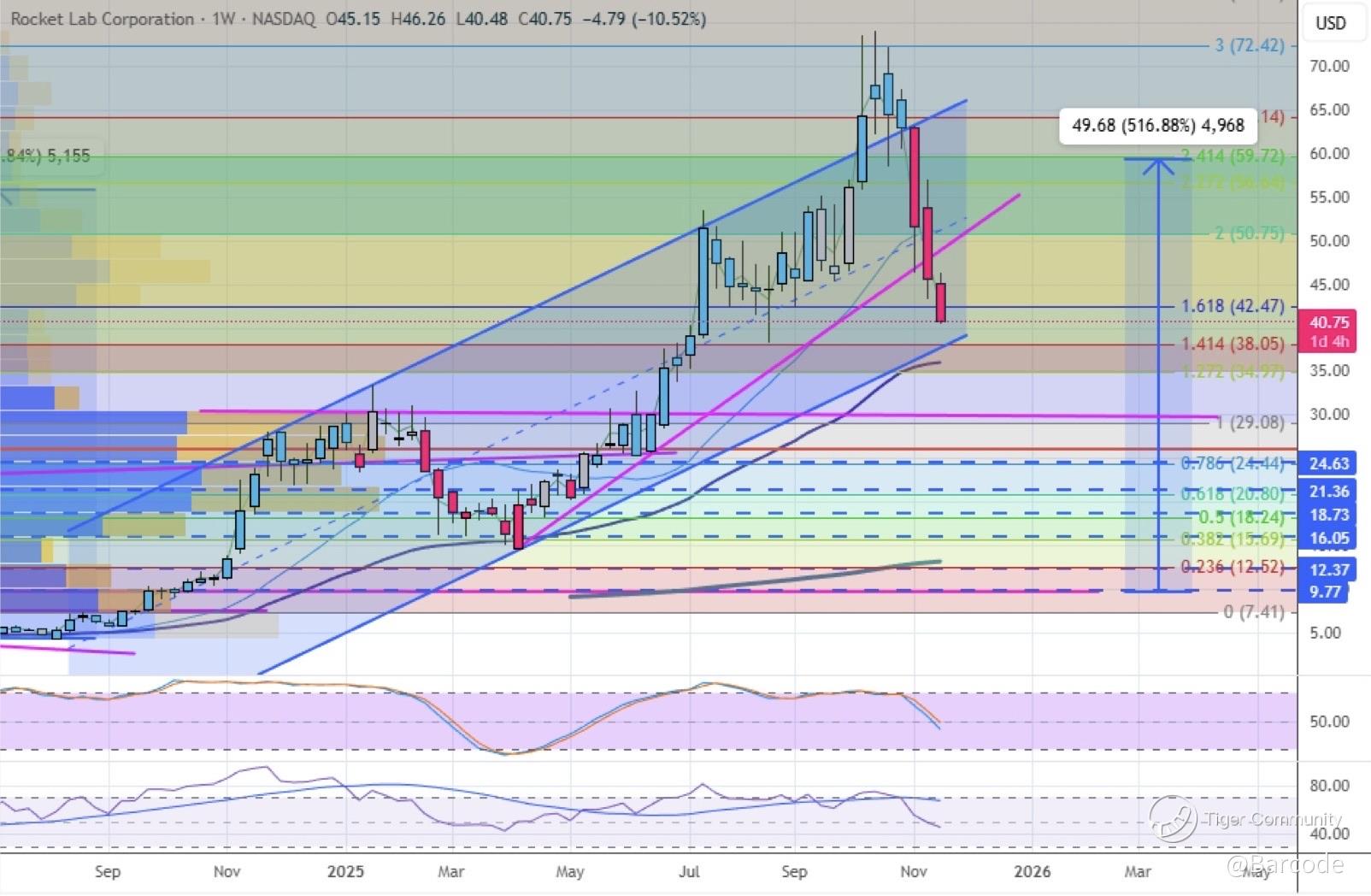 Iโm watching $RKLB sit directly on the 1.618 Fibonacci extension at $42.47, the same weekly confluence that capped the last 500% advance. Yesterday I saw the flush into $40.26 hit the exact channel floor before snapping back into $43.32. The volume thinning across that zone confirms exhaustion, not distribution. This is where sellers usually run out of fuel.