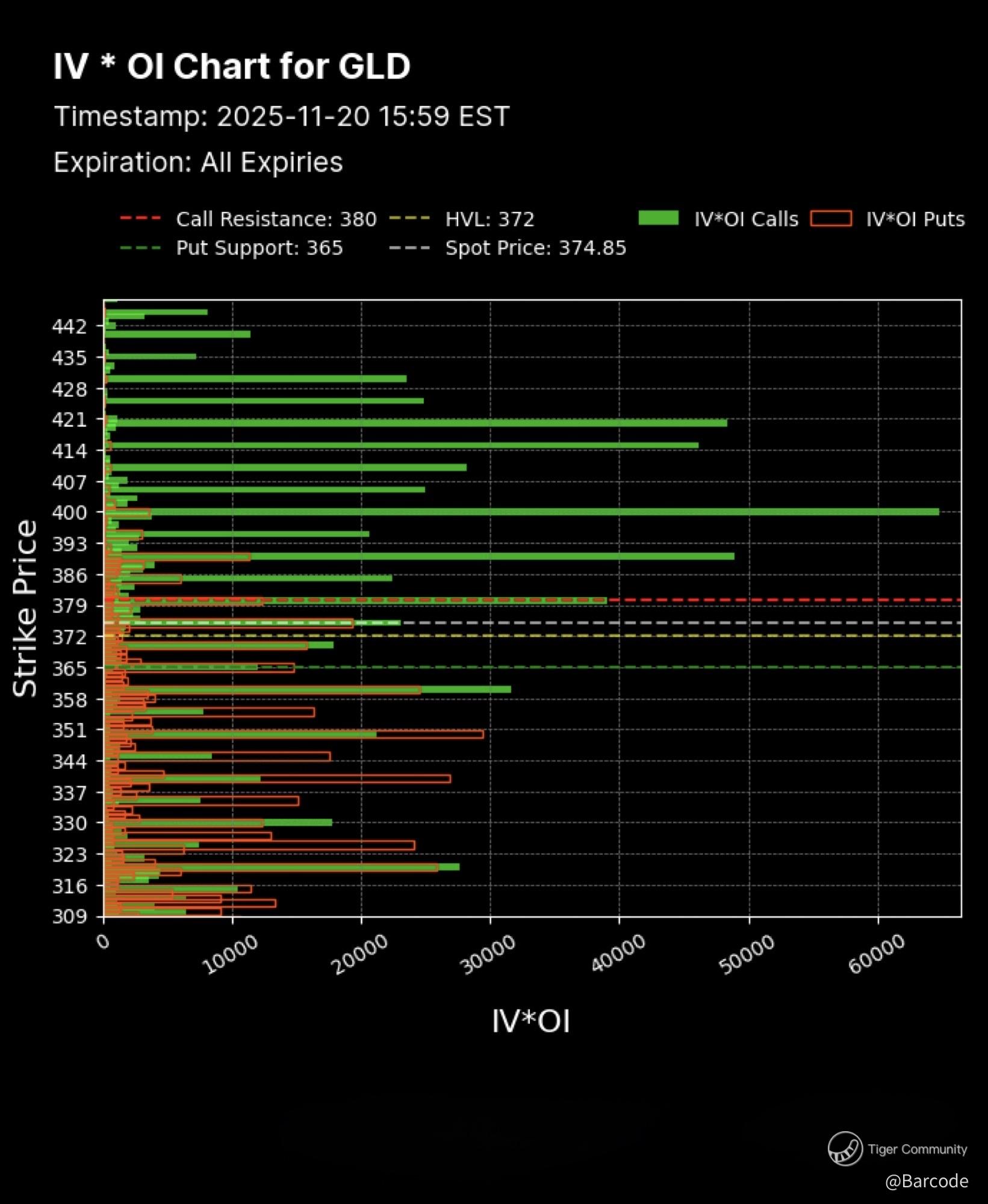 $GLD mirrors the futures tape with almost perfect symmetry. IV*OI is expanding across the upper call bands, especially around 420 to 425, and the put support band at 365 aligns precisely with the 372 HVL. When implied volatility and open interest sync with realised price behaviour this neatly, it almost always reflects institutional positioning rather than speculative noise. I have seen this pattern precede multi month runs across every gold cycle since the early 2000s.