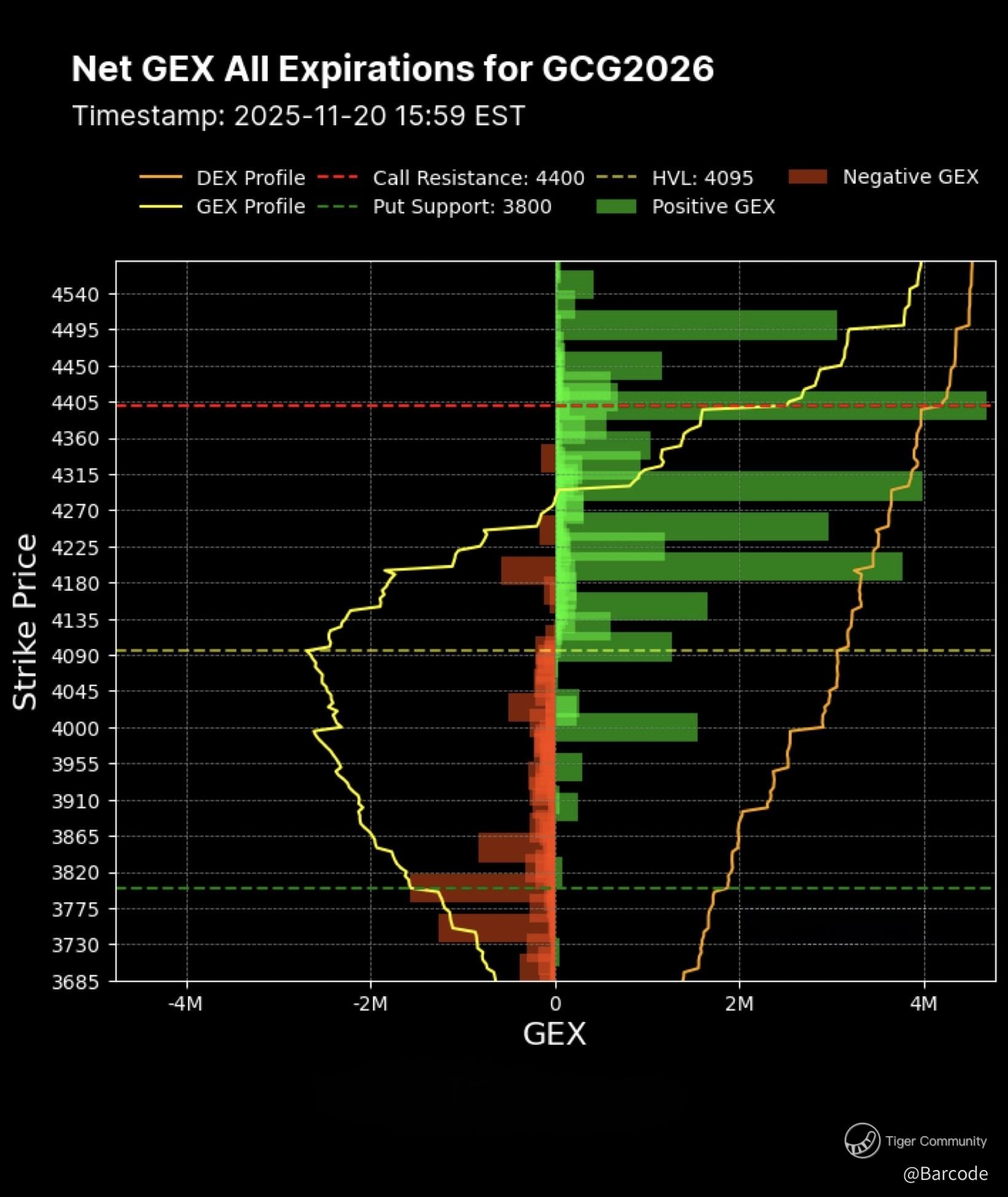 The GC futures chain is showing a clean, supportive build. Positive GEX is stacking across the mid to upper strikes, clustering near 4100 to 4150, while a reinforced put wall sits just under 4000. That structure has always been a classic footprint of disciplined accumulation during macro uncertainty. Open interest confirms the shift, with net long exposure rising and the put or call ratio slipping under 1.0, the earliest sign that conviction is replacing caution.