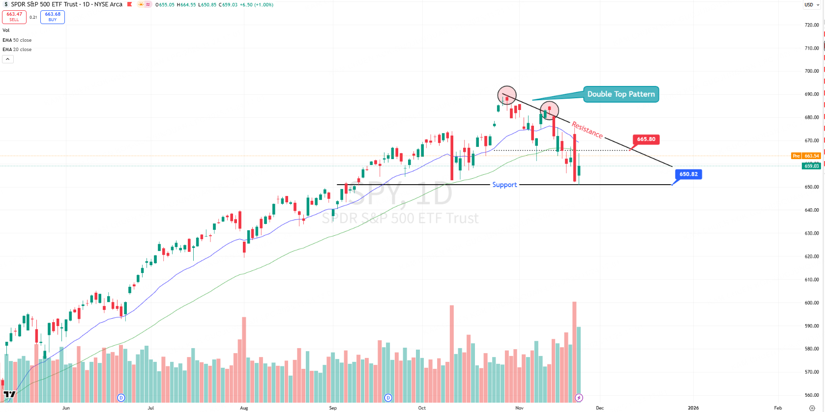 SPY closed at $659.03 (+1.00%), recovering from recent weakness with the index climbing back above the $655 support level, though still 4.5% below its 52-week high of $689.70.