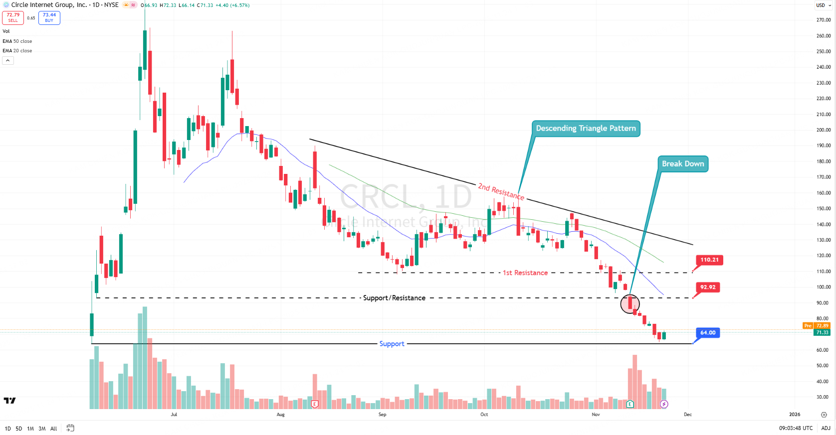 CRCL closed at $71.33 (+6.57%), recovering strongly from recent lows but still 76% below its 52-week high of $298.99. The stock demonstrated significant intraday volatility with a 9.25% amplitude.