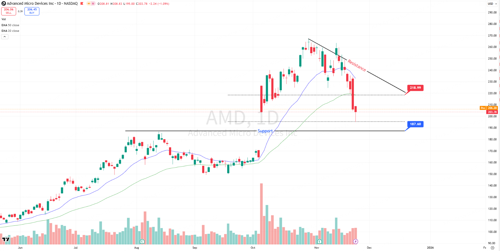 AMD closed at $203.78 (-1.09%), extending recent decline from 52-week high of $267.08, now trading ~23.7% below peak levels. Evening session price at $205.76 shows modest after-hours recovery.