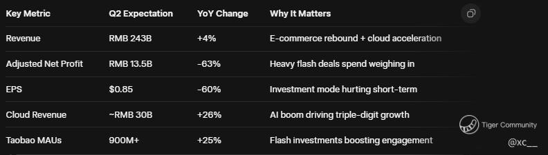 $Alibaba(BABA)$ Buckle up, folks—Alibaba's FY2026 Q2 earnings drop tomorrow, and the buzz is electric! 📈 After sliding from that $192 peak, shares are hovering around $161 today, but whispers of a rebound are growing louder. Analysts are eyeing a revenue pop to about RMB 243 billion, up 4% year-over-year, fueled by e-commerce tweaks and a cloud business that's absolutely crushing it. 😎 But hold the confetti: adjusted net profit might dip to RMB 13.5 billion, down 63%, thanks to hefty investments in flash deals and AI. EPS? Pegged at roughly $0.85, a sharp drop from last year's $2.10, as the company pours cash into growth plays. Will they beat or flop? I'm betting on a mild revenue beat—cloud's AI-driven 26% growth last quarter could steal the show—but profits might miss amid deflationary pressures and fierce competition from Pinduoduo. 🌪️