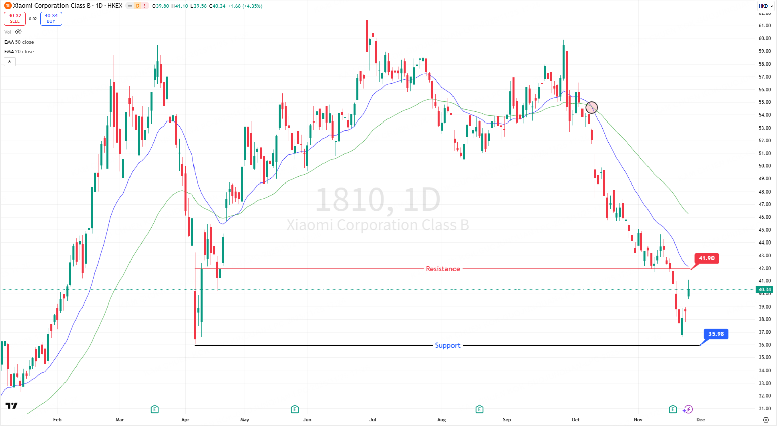 Support: The zone around HK$38.50 - HK$39.00 is a critical support level. A break below this could trigger a further decline towards HK$35-36.