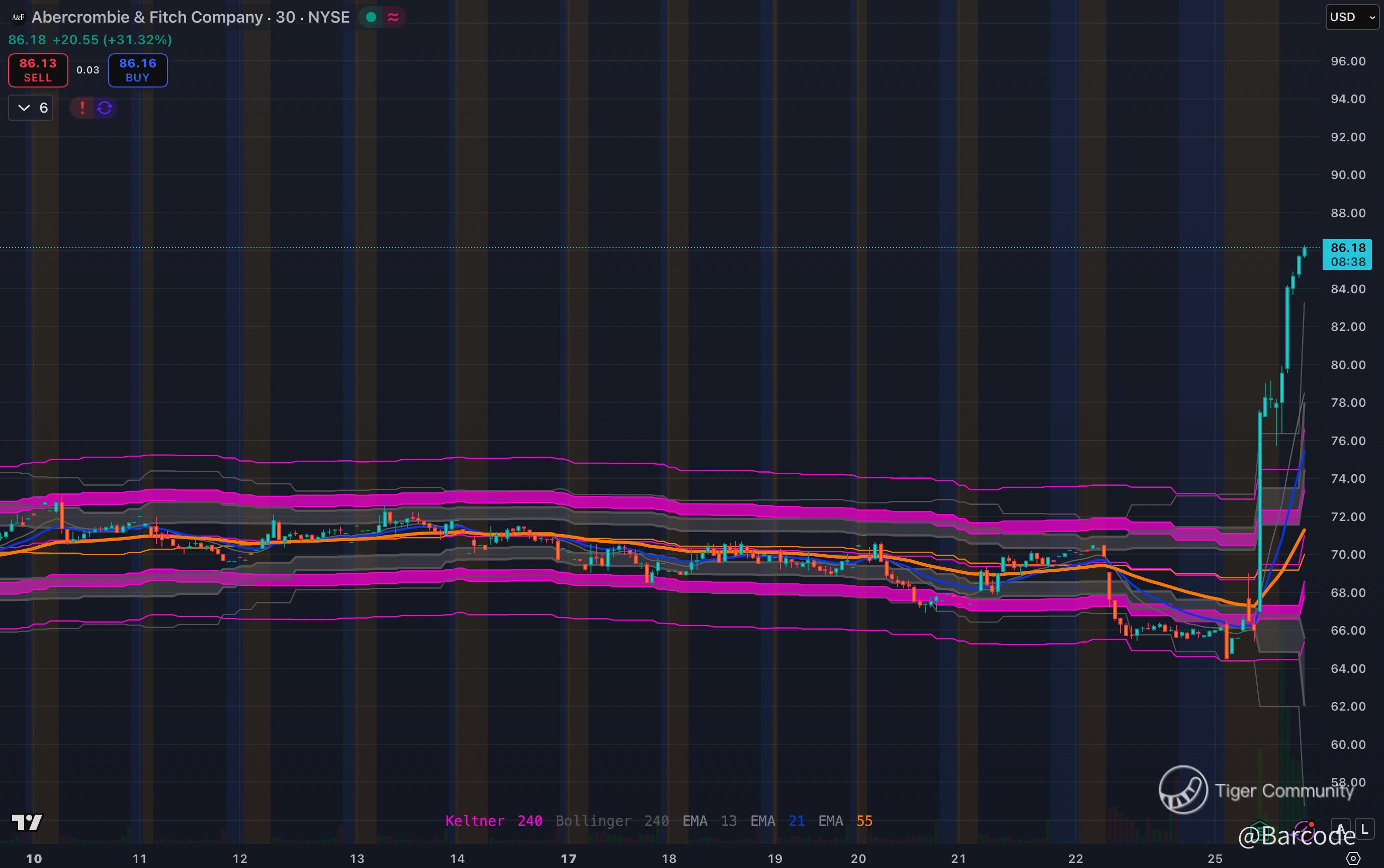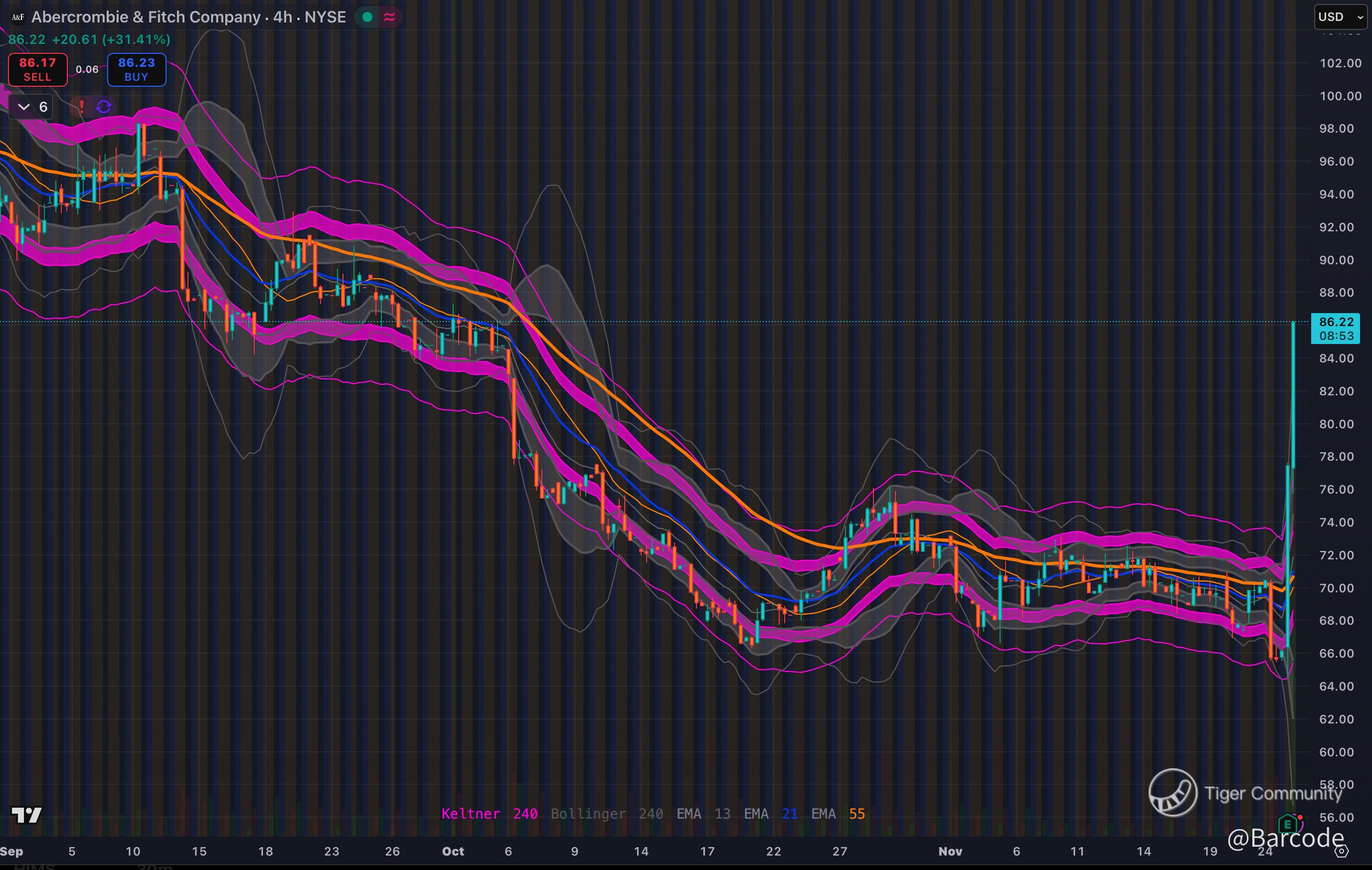I believe $ANF stands at a powerful inflection point. Hollister strength is structural rather than cyclical and the guidance raise signals high conviction execution. The key risk remains tariffs and sustained APAC softness, but the company is demonstrating portfolio wide resilience with tightening unit inventory, gross margin stability, and strong cash flow. Ideal entries sit near post breakout consolidation zones with stop levels beneath prior support. Base targets reflect strengthened earnings visibility and raised EPS guide, while stretch targets require Abercrombie stabilisation and tariff moderation. Upcoming catalysts include holiday sell through, tariff policy developments, Q4 operating income delivery of approximately $220M, and continued institutional inflows.