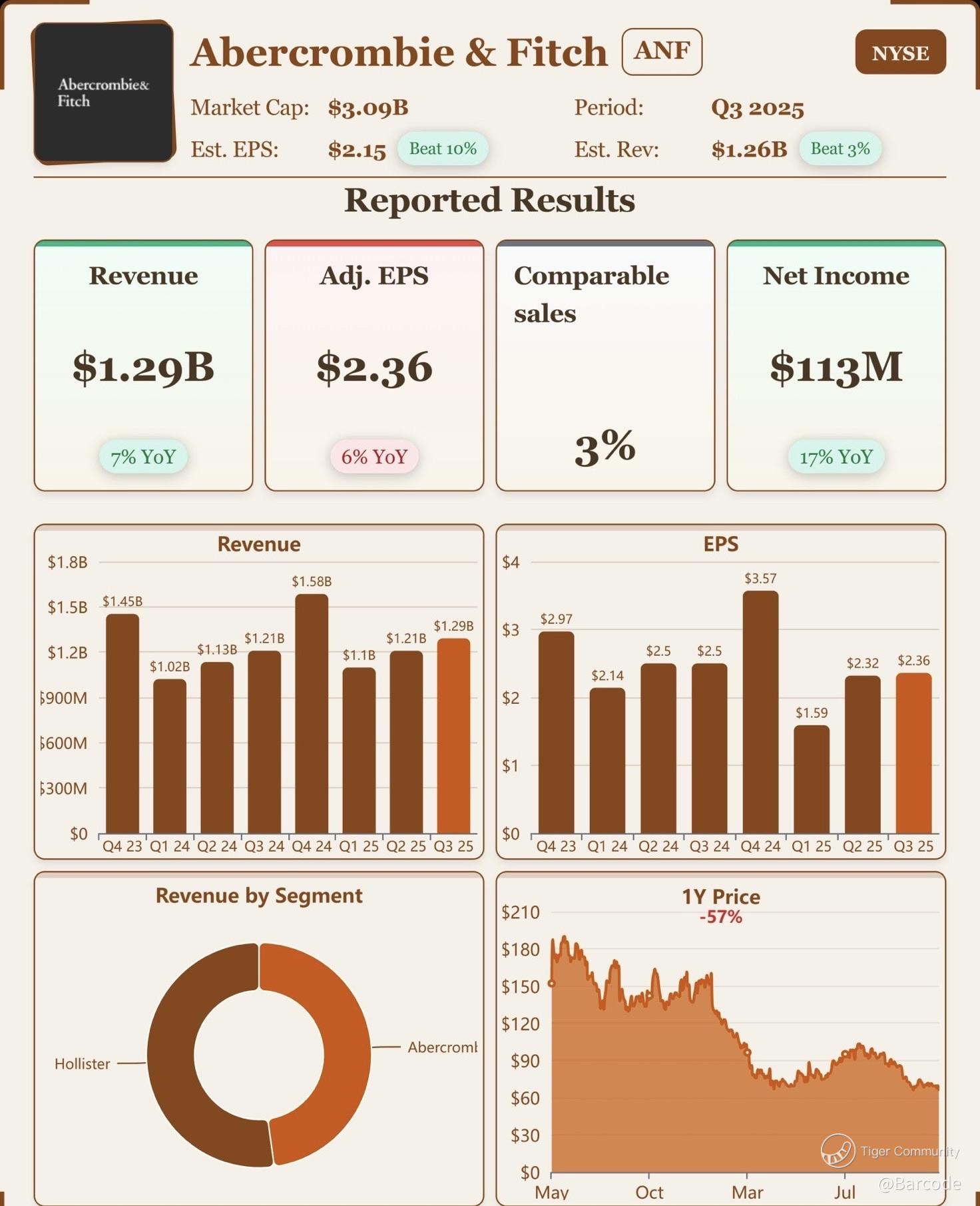Abercrombie brand contraction continued with sales down 2% and comps down 7%, marking a second consecutive quarterly decline. Menโs outerwear softness down approximately 10% signals premium pricing fatigue similar to recent weakness in Lululemonโs discretionary categories. Operating margin compressed to 12.0% from 14.8% due to a sharp 210 basis point tariff impact with full year drag expected at approximately $90M. Escalation of Section 301 tariffs post election could expand that cost burden toward $110M in FY26. APAC remains weak with sales down 6% and comps down 12%, driven by China traffic down 15% although Japan and Korea store comps are recovering at approximately 10%. Q4 guidance reflects 4 to 6% revenue growth and approximately 14% margin versus 16.2% last year, indicating ongoing promotional intensity. Marketing expenses rose 12% YoY to defend Abercrombie brand positioning, constraining incremental leverage as the company works to stabilise AUR gains into Q4.