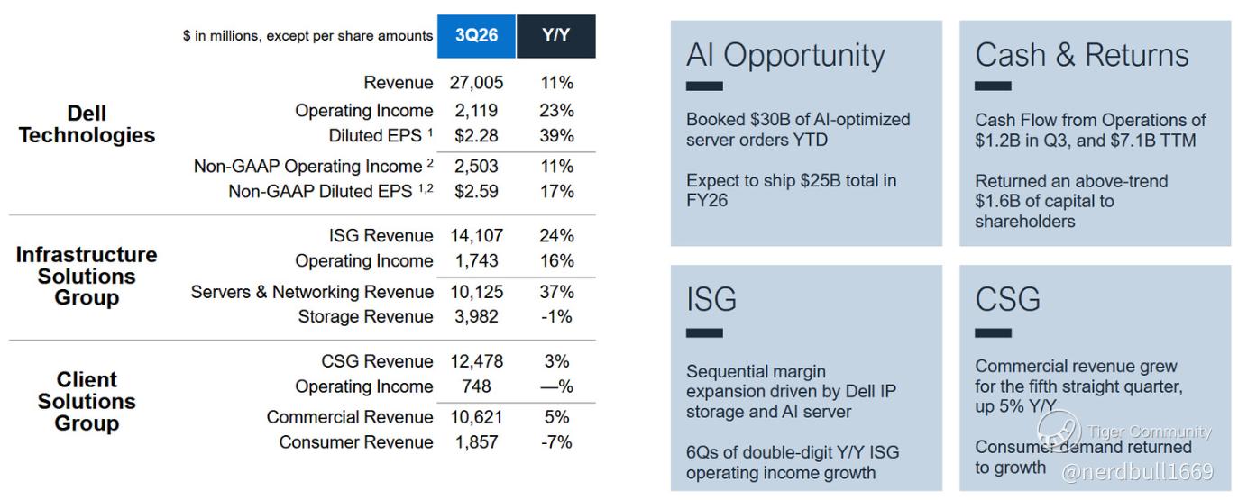 $Dell Technologies Inc.(DELL)$'s latest earnings report (Q3 Fiscal 2026, released November 25, 2025) offers a definitive counter-argument to the "AI bubble" skeptics, even if the immediate stock price reaction was volatile.