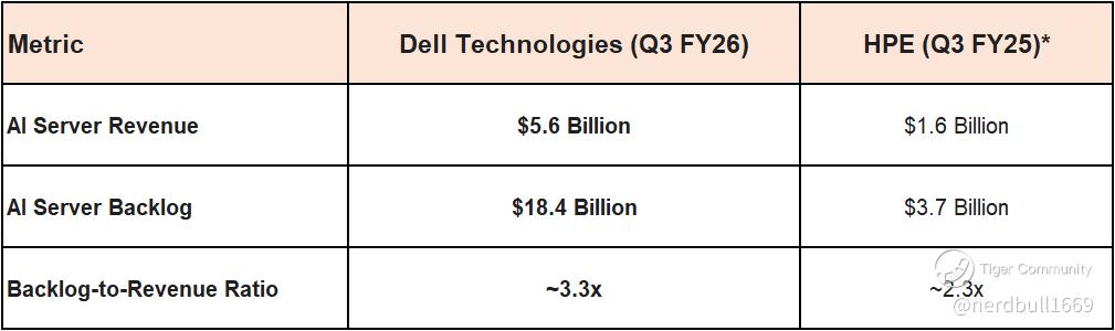 HPE (2.3x): HPE's lower ratio and significantly smaller backlog ($3.7B vs. Dell's $18.4B) suggest it is winning "spillover" demand but is not the primary partner for the massive Tier 2 cloud builds that Dell is securing.