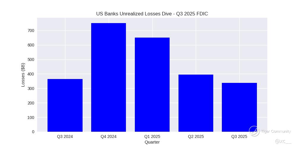 Wall Street's sleeping giant just stirred β US banks are hauling a colossal $337 billion in unrealized losses on their bond portfolios as of Q3 2025, a stealthy time bomb buried in balance sheets that's got regulators sweating and investors eyeing the exits. Fresh FDIC data dropped yesterday (Nov 25) shows these paper losses eased 14.7% from Q2 and 7.4% YoY, but they're still a whopping $337.1B drag, locking up $6T+ in underwater securities that choke lending and spark runs if panic hits. Regional players? They're the powder keg, with uninsured deposits fleeing at the first whiff of weakness β think SVB 2.0 on steroids. But with Fed cuts whispering relief (December odds at 78%), could falling rates inflate bond values and defuse the crisis? Or are we one credit scare from a cascade? We're peeling back the layers, crunching the fresh numbers, and spotting the plays before the blast. No hype, just hard facts on this hidden hole that's freezing credit and testing the system's spine. π€π