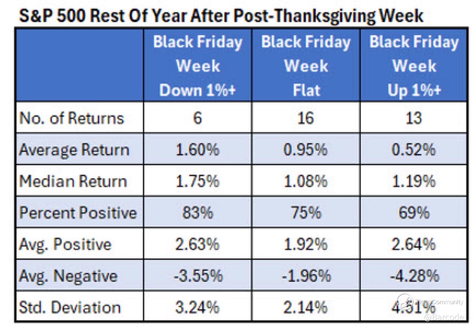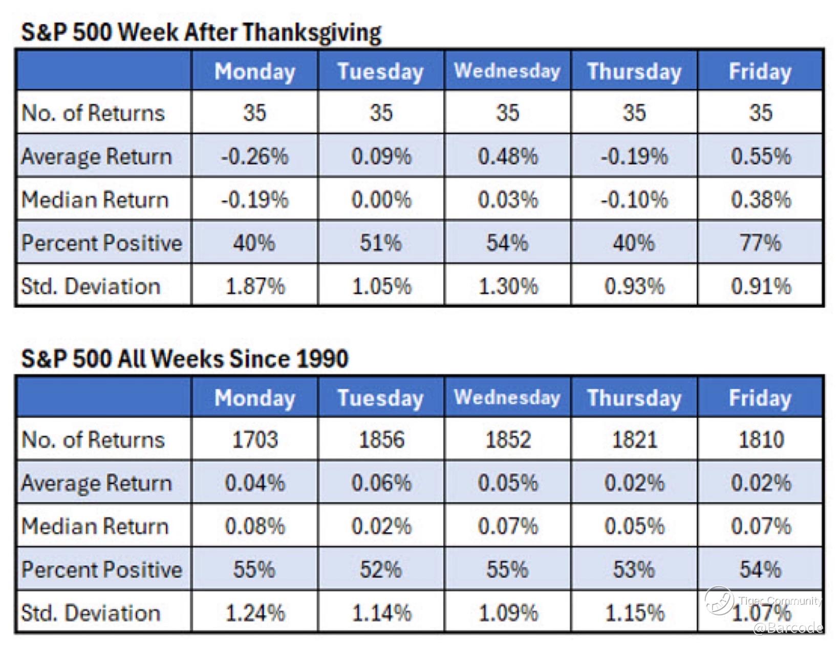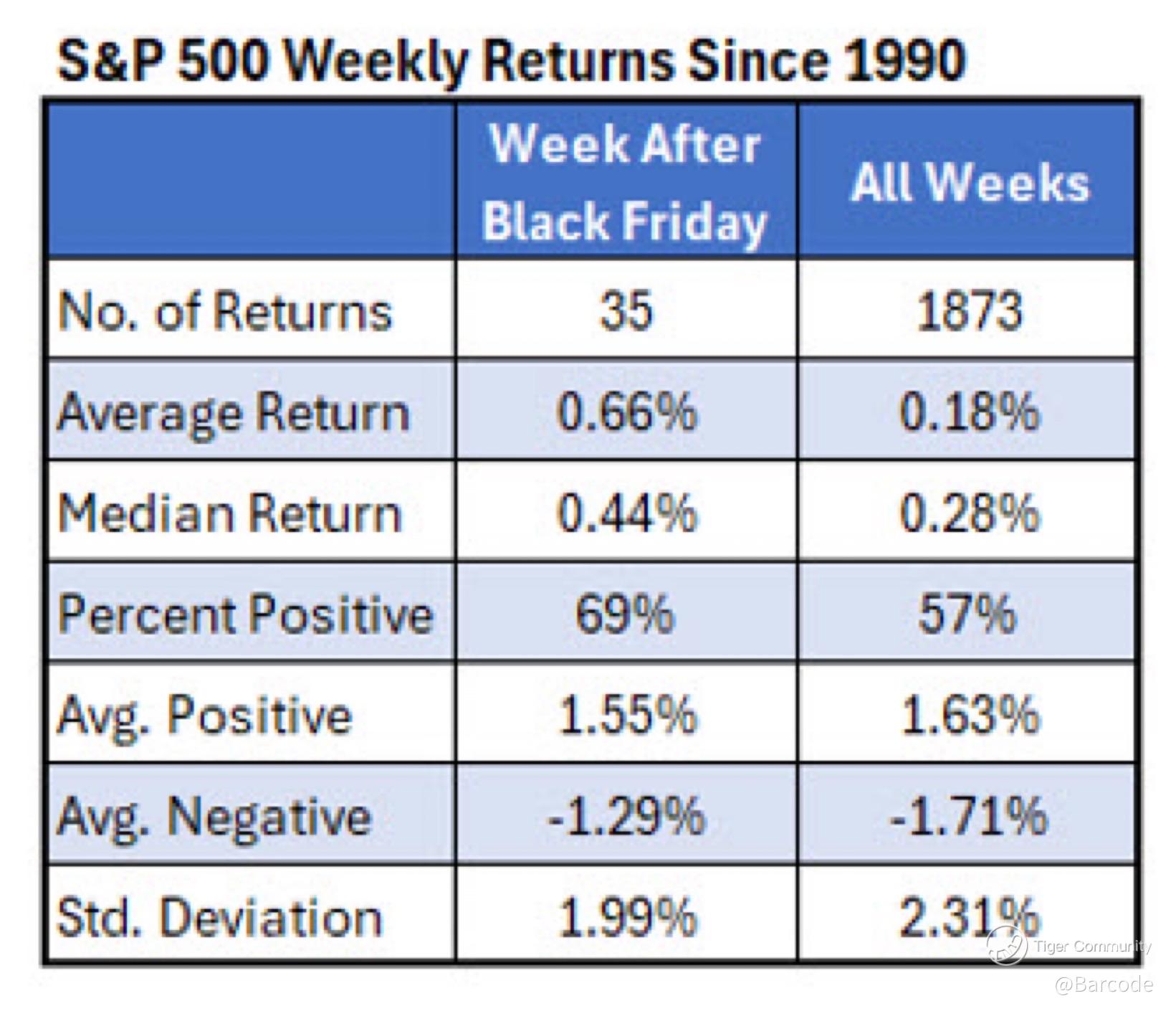 I am tracking the post Thanksgiving structures because they give me a clear probability map instead of a narrative guess. Since 1990, the week after Black Friday has averaged +0.66% for the $SPX with a 69% positive rate, more than three times the average for all weeks. The median return lifts from +0.28% to +0.44% and volatility compresses relative to the long run baseline. This is one of the strongest seasonal edges on the calendar.