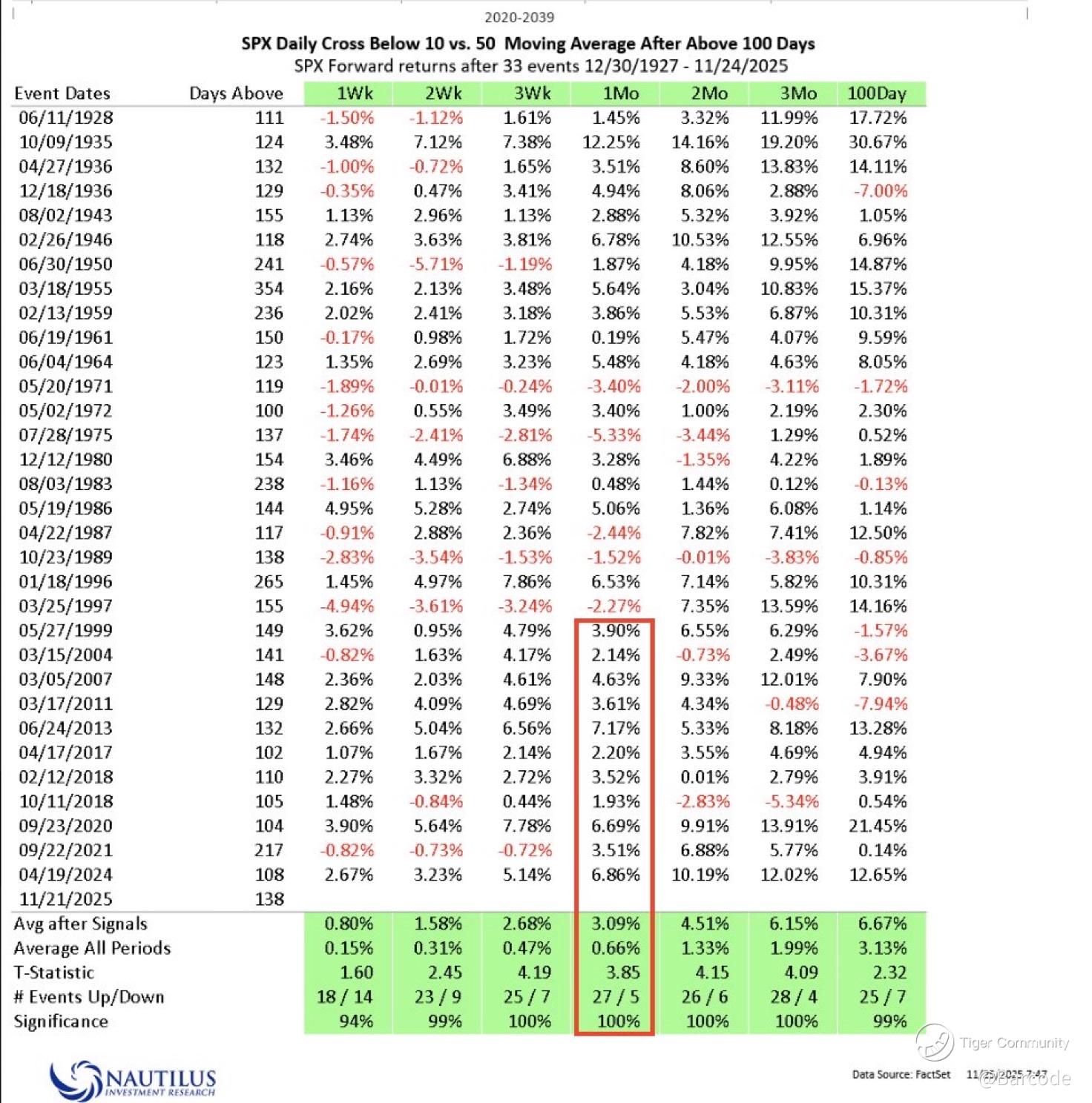 At the same time, volatility has been crushed. VIX has reset from peaks above 28 in late November to the low 18s. That is the sharpest monthly volatility contraction since March and it has occurred alongside roughly a 2% November drawdown, the weakest monthly performance in eight months. This backdrop has now triggered a rare pattern. The $SPX 10 day moving average has closed below the 50 day moving average after being above it for at least 100 days. Since 1999, every single time this has occurred, $SPX has been positive one month later with an average return greater than +3%. I treat that as quantified asymmetry. S&P 500 $SPX bias? Up.