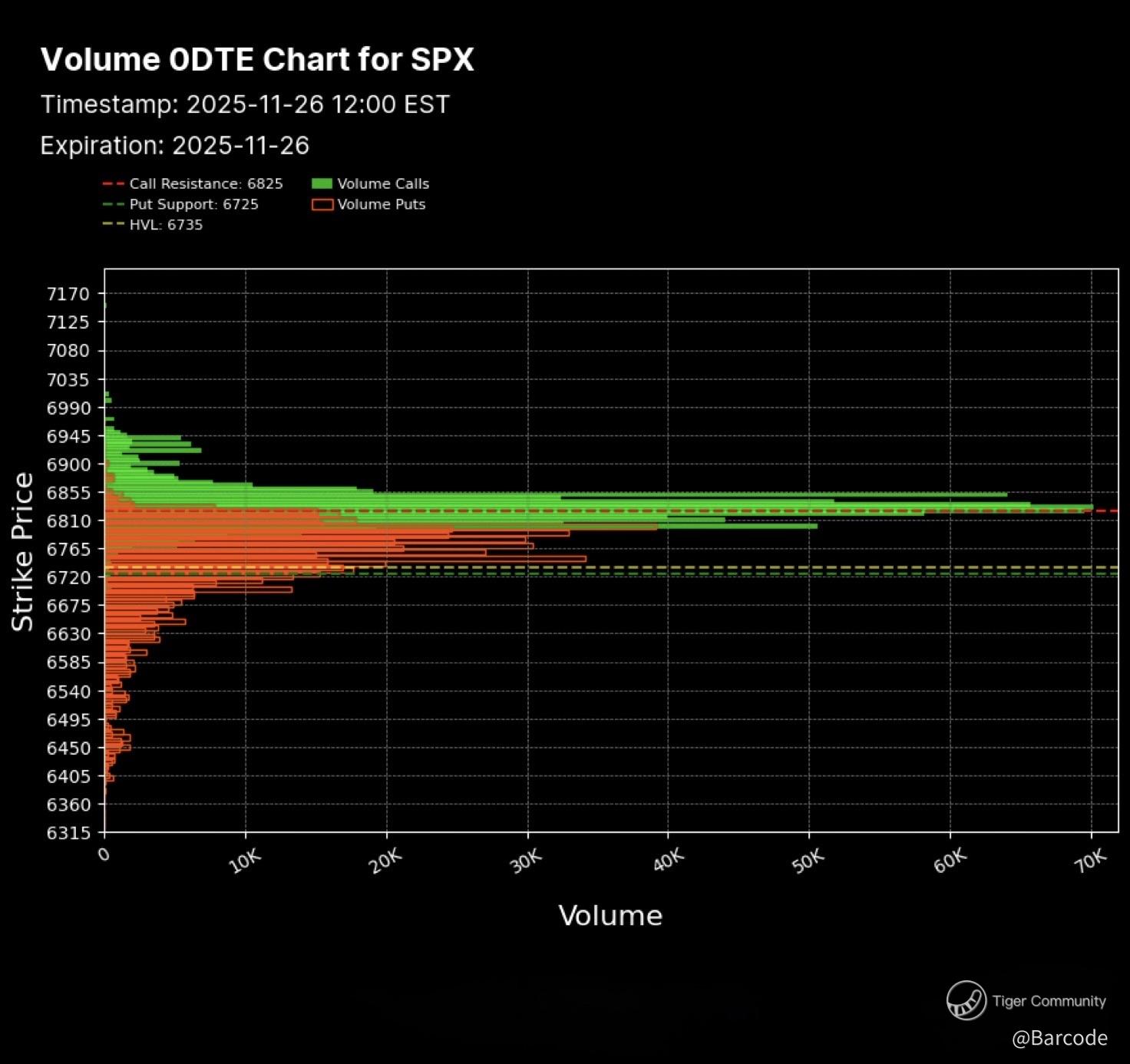 Gamma is clustered around current spot levels. Short dated Gamma pinnings compress intraday volatility and keep price inside a tight intraday corridor until there is a clear break. When $SPX pushes through the upper end of the band, especially above $6,850, that Gamma profile can flip from suppression to propulsion. That is where you can see explosive convexity as small pushes lead to outsized moves.