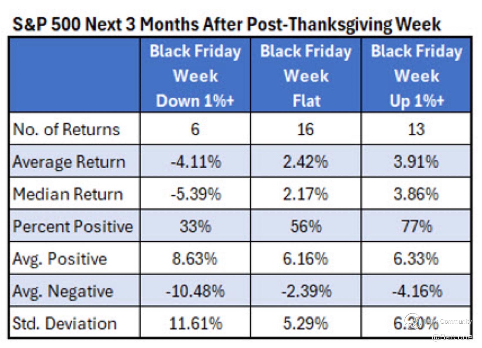 I am then using conditional performance to map the next three months. When Black Friday week finishes up by at least +1%, the next three months average +3.91% with a 77% positive frequency. When the week is flat, the next three months average +2.42% with a 56% hit rate. When the week finishes down by at least 1%, the next three months average minus 4.11% with only a 33% positive rate. This gives me a structured way to weight scenarios without anchoring to noise.