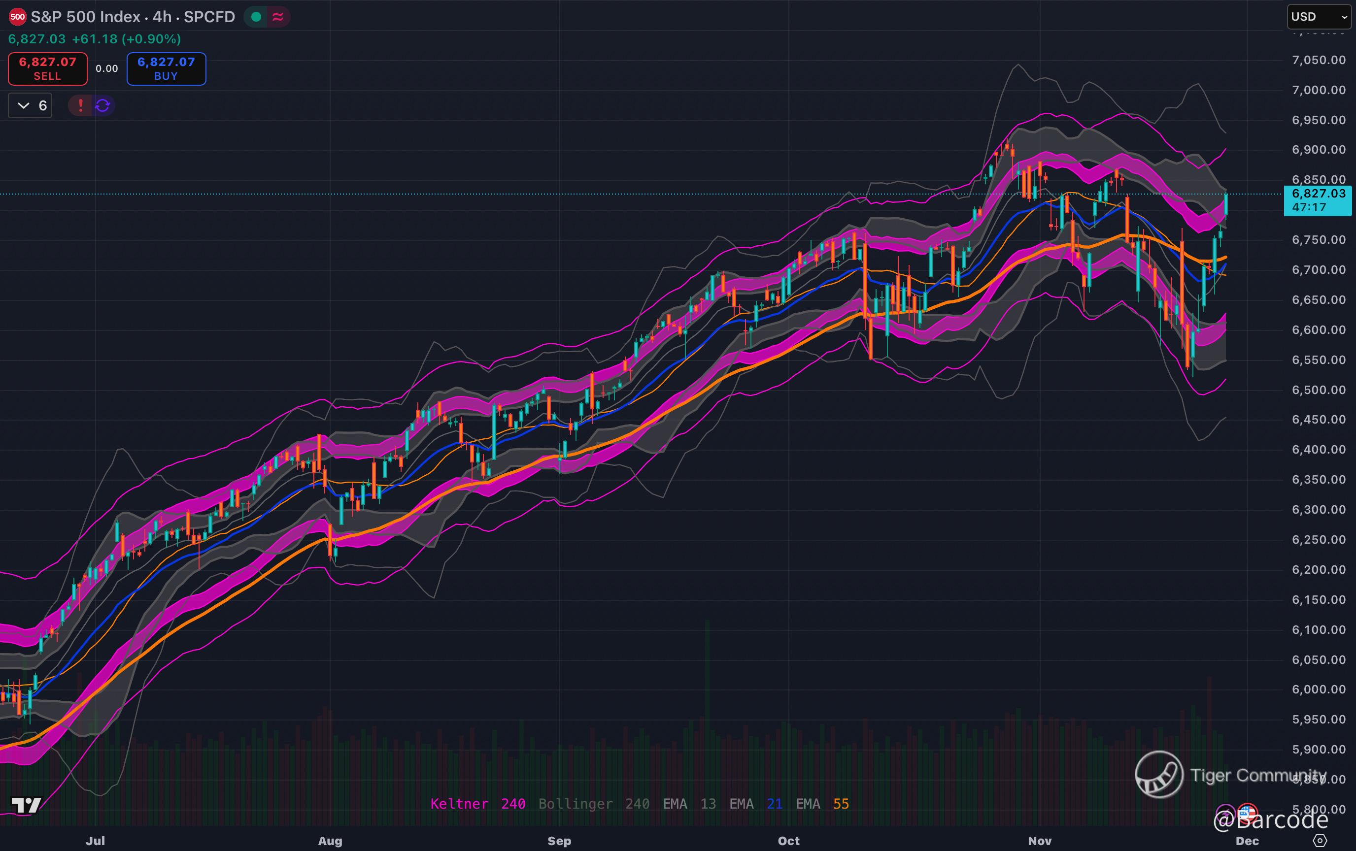 $S&P 500(.SPX)$ $SPDR S&P 500 ETF Trust(SPY)$ $Invesco QQQ(QQQ)$ I am watching a live VOL crush and $SPX has already met my $6,830 π― level. Right now, while the market is still open, $SPX is trading around $6,827 and pushing into the key resistance band I track between $6,825 and $6,850. Earlier in the week we saw a tactical flush down toward $6,650. Since then price has reclaimed the $6,800 shelf and is now re-engaging the upper Keltner and Bollinger envelopes on my 4H chart. This is exactly where I want to see how the market responds to the big level today.