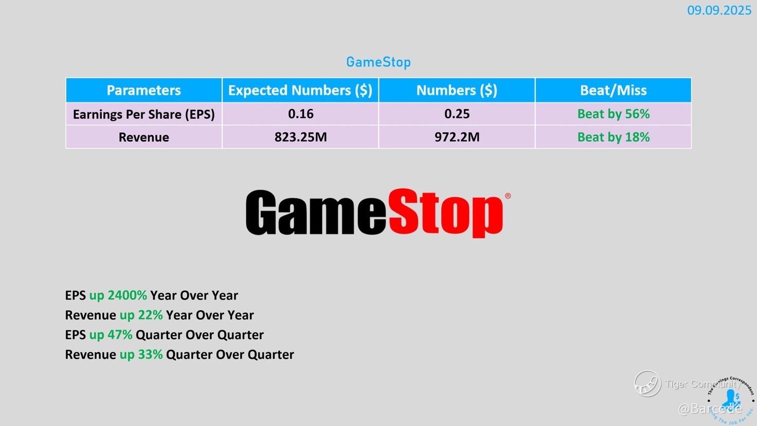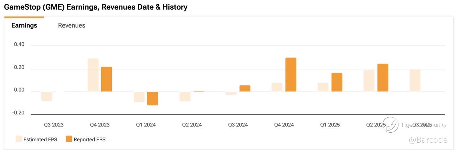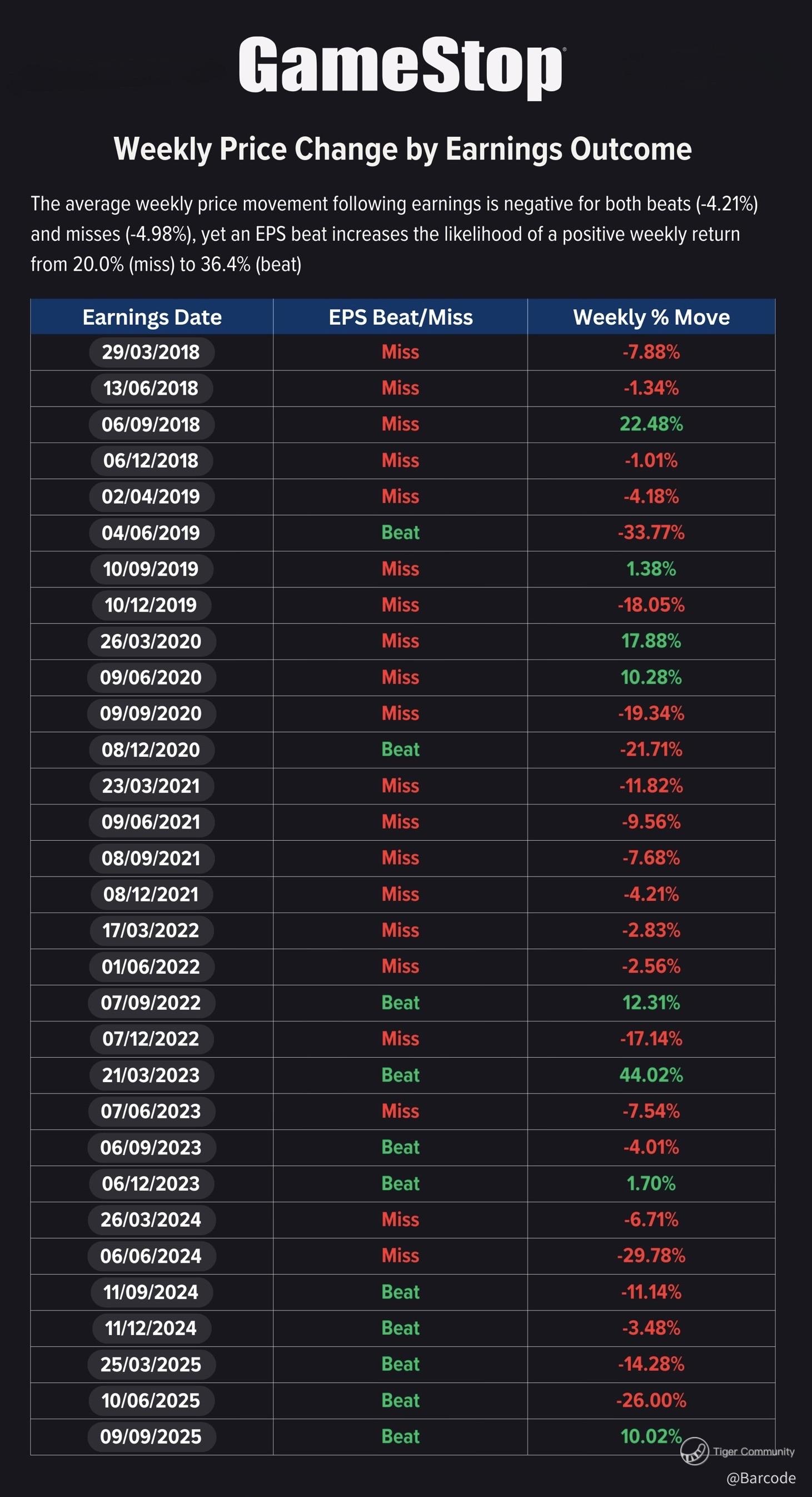 Retail chatter is heating up as GameStop $GME heads into Q3 results after the close on Monday, 12/8. I’m framing this print with numbers first. Street expectations sit around EPS of $0.20 versus $0.06 last year and revenue near $987M which implies about +15% YoY.
