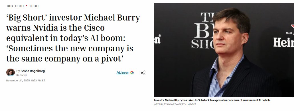 Nvidia $NVDA is just like $Cisco(CSCO)$ during the Dot Com Bubble, warns Big Short Investor turned Substack writer Michael Burry π¨π¨