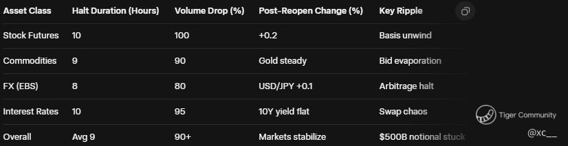 Global Ripple Rampage: From Gold to FX Freeze-Outs πβοΈ Dow futures? Locked. Crude contracts? Paralyzed. EBS FX volumes? Down 80% during halt. Gold traders mid-rally (spot at $4,141) faced blind bids, while Nasdaq-100 plays evaporated β amplifying volatility as alternatives like ICE saw 15% volume spikes. Asian desks scrambled, European bonds wobbled; total disrupted notional? Estimated $500B+ in stalled trades.